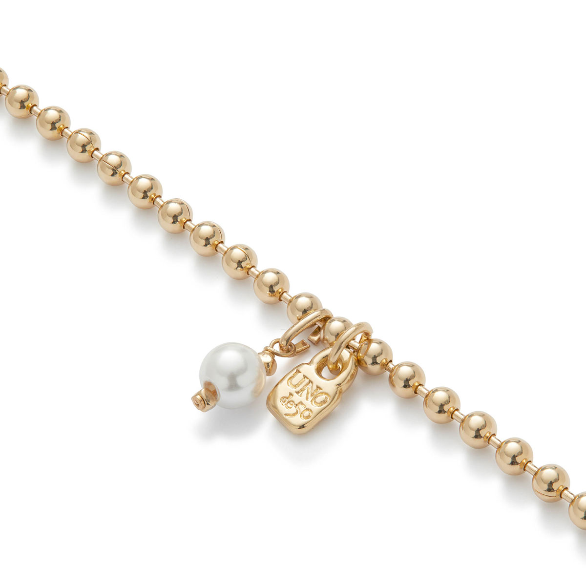 Изящный браслет с золотом и искусственным жемчугом арт. PUL2554BPLORO0M из коллекции SER UNICO — стильный аксессуар, который органично дополнит любой образ. Аксессуар представляет собой цепочку из металлических бусин, которая украшена двумя подвесками. Одна — в виде легендарного замочка, декорированного фирменной надписью UNOde50. Вторая — в виде крупной искусственной жемчужины, сияющей перламутром. Пусть ваш образ несет в себе загадку, тайну, которая надежно спрятана под замком, но готовая открыться тому, кто разбудит в сердце любовь. Ведь именно ее символизирует жемчуг. Изделие ручной работы, изготовленное из уникального сплава ZAMAK, — эксклюзивное украшение, которое достойно стать дополнением как к повседневному, так и вечернему наряду.