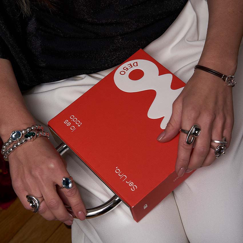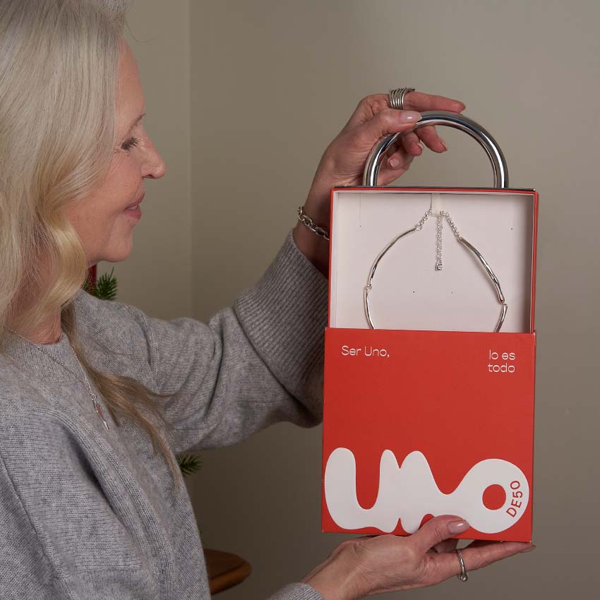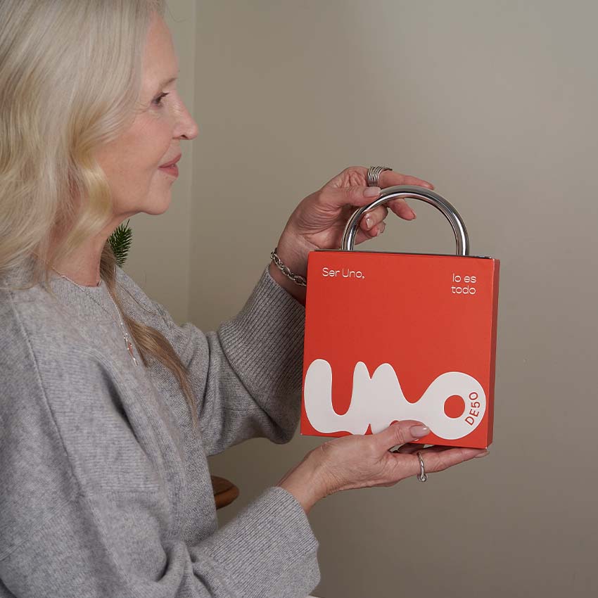 Каждая упаковка оснащена удобной ручкой из прочного пластика, покрашенной под серебристый металл. На лицевой стороне расположены крупный белый логотип UNOde50. Над логотипом мелкая надпись — «ser uno, lo es todo», что в переводе значит «Быть собой — это всё» и подчеркивает философию бренда и его стремление вдохновлять на искренность и самовыражение.