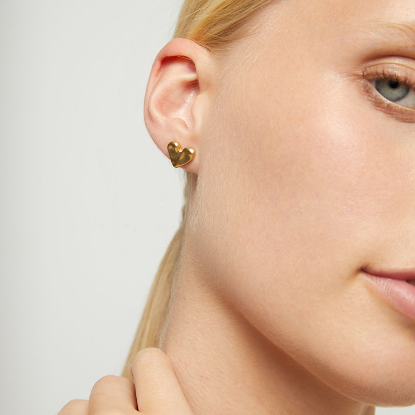 Серьги выполнены из сплава ZAMAK с золотым покрытием. Застежки-пусеты обеспечивают надежную посадку в ухе. Украшение выполнено вручную и имеет неповторимую слегка неровную форму. Отлично подойдет как для базовых, так и более праздничных образов. Украшение станет символом вашей трепетности и особенно хорошо будет выглядеть в сочетании с кольцом этой же модели.