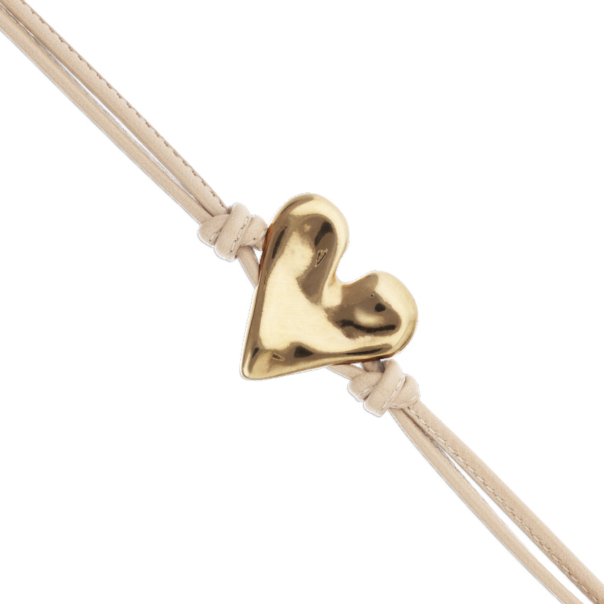 Браслет выполнен из натуральной кожи теплого бежевого оттенка и дополнен сердцем из сплава ZAMAK с золотым покрытием. Неровная, живая форма подчеркивает ручную работу и делает каждое украшение уникальным. Кожаный ремешок удобно садится на запястье и подходит для ежедневной носки. Браслет легко впишется в повседневные образы и станет вашим символом привязанности — к себе, к чувствам, к собственному ритму.