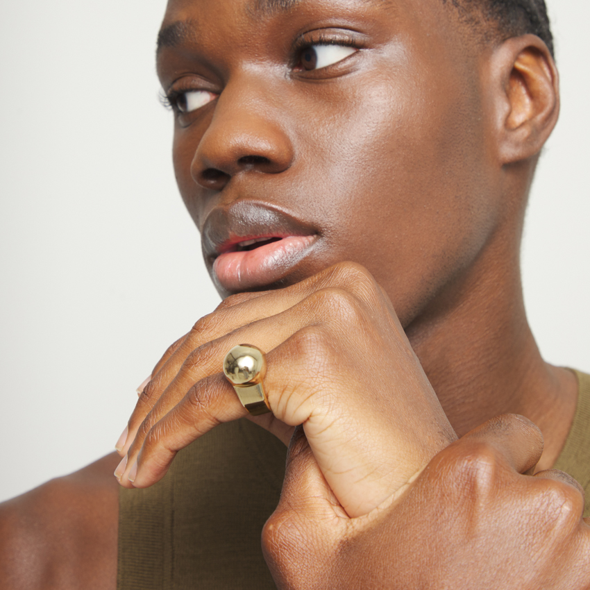 Кольцо выполнено вручную из сплава ZAMAK с золотым покрытием. Дизайн кольца строится вокруг ассиметричного массивного округлого элемента, который заметно выступает над линией пальца. Гладкая поверхность делает объем особенно выразительным и притягивает взгляд. Кольцо комфортно сидит на руке и подходит для повседневной носки. Украшение станет вашим символом осознанного отношения к себе и своей ценности.