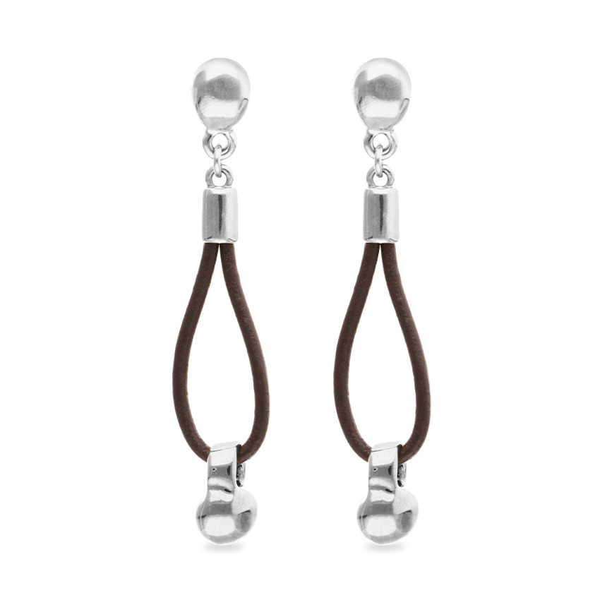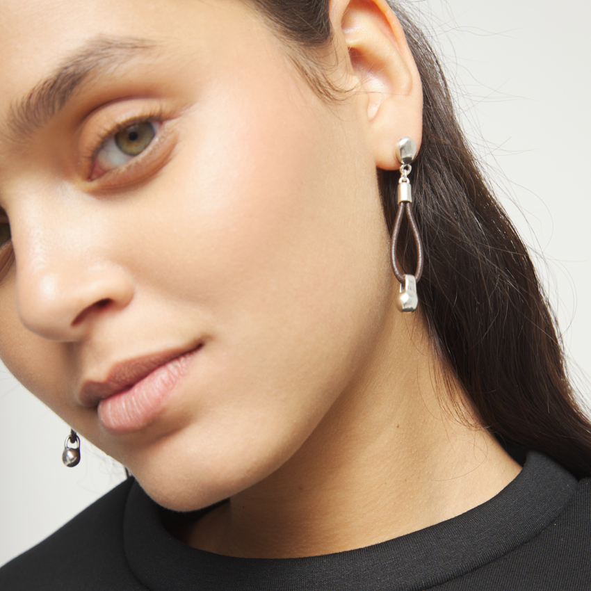 Серьги выполнены вручную из натуральной кожи и дополнены элементами из сплава ZAMAK с серебряным покрытием. Дизайн украшения состоит из тонкого кожаного шнура, который образует вытянутую петлю, и металлической подвески в форме сосуда. Контраст коричневой кожи и гладкого металла создают строгий мотив.