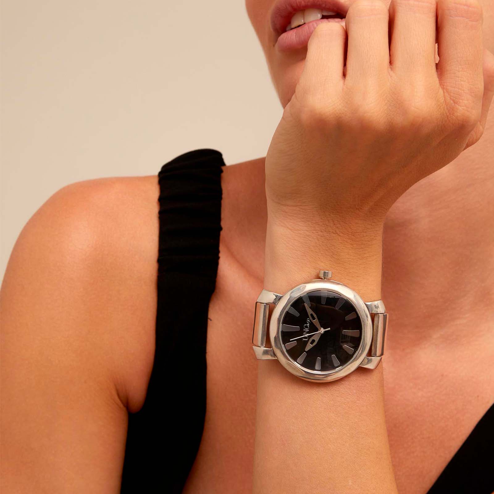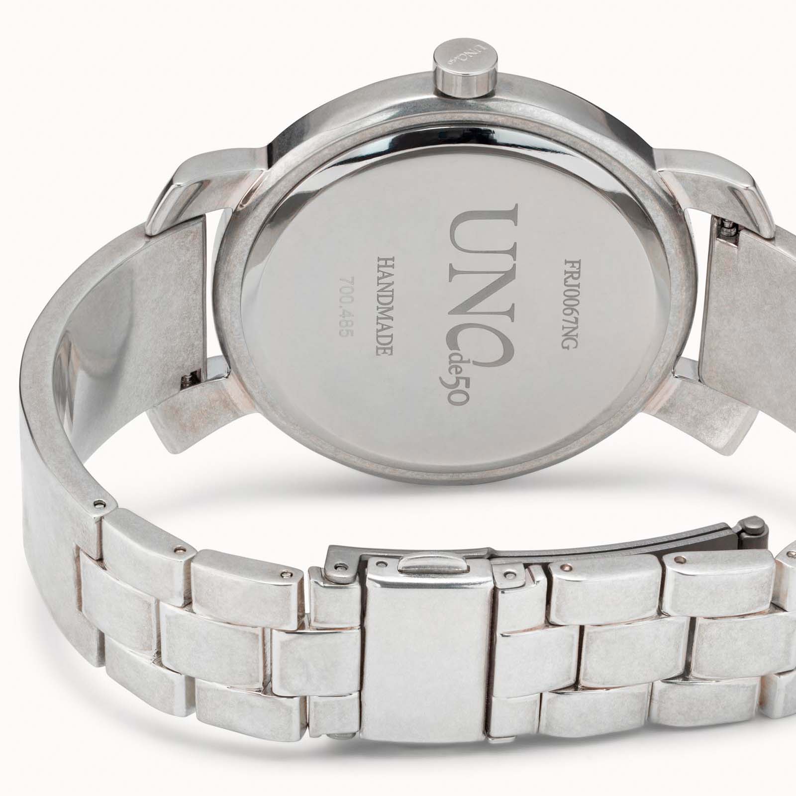 Наручные часы Cuenta Atras (REL0136NGRMTL0U) от испанского бренда UNOde50 — классические мужские часы, выполненные в стиле унисекс. Они изготовлены из качественного металлического сплава ZAMAK с серебряным покрытием, что обеспечивает их долговечность и стильный внешний вид. Черный циферблат часов украшен часовыми стрелками серебряного цвета, а на обороте циферблата находится фирменная гравировка с названием бренда «UNOde50».