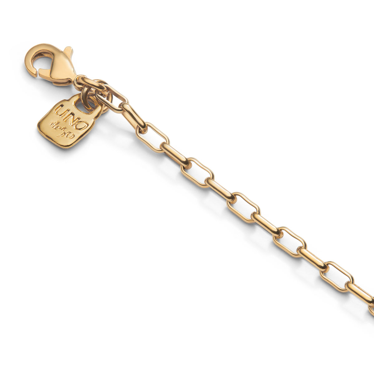 Экспериментируйте с образами, как хотите, благодаря длинной цепочке из звеньев, с золотом, арт. COL1969ORO0000U из коллекции Hazte Uno. Этот базовый аксессуар собран из продолговатых скругленных звеньев и имеет длину 85 см, что позволяет надевать его по-разному: в полную длину или в несколько охватов вокруг шеи. Поэтому украшение прекрасно смотрится с разной одеждой и различными вариантами ворота. Колье застегивается с помощью удобного карабина, украшенного пластиной с фирменной символикой. Для изготовления изделия использован уникальный металлический сплава ZAMAK с покрытием из 18-каратного золота. Особые свойства металла вкупе с ручной работой наполняют аксессуар особенным шармом.