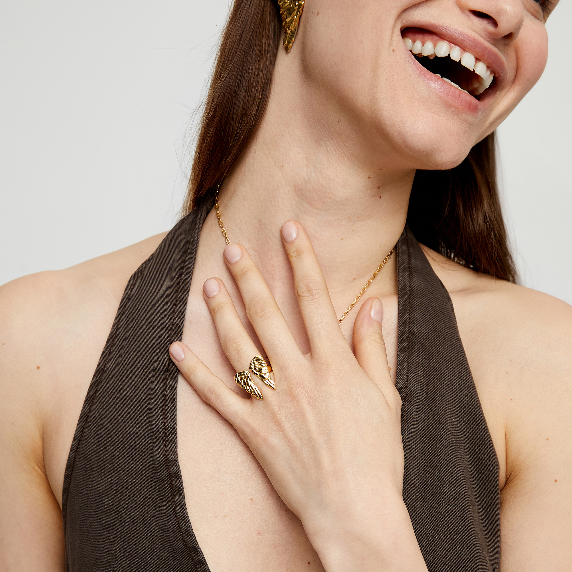 Кольцо «Крылья Ser Invencible» с золотом - настоящее сияние полета, воплощенное в золоте. Его крылья словно выточены из солнечных лучей, чтобы напоминать: внутренняя сила и свобода не тускнеют, а лишь становятся ярче с каждым новым шагом.