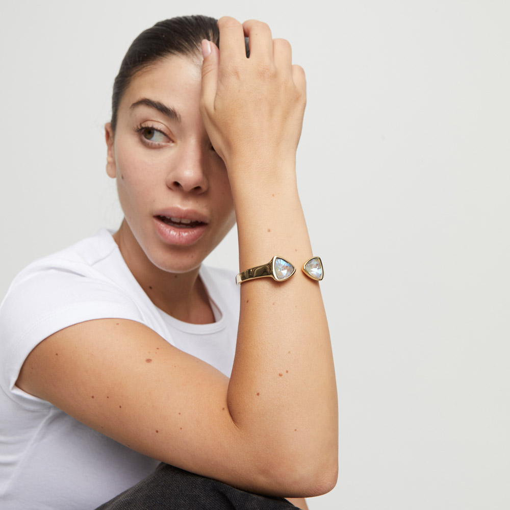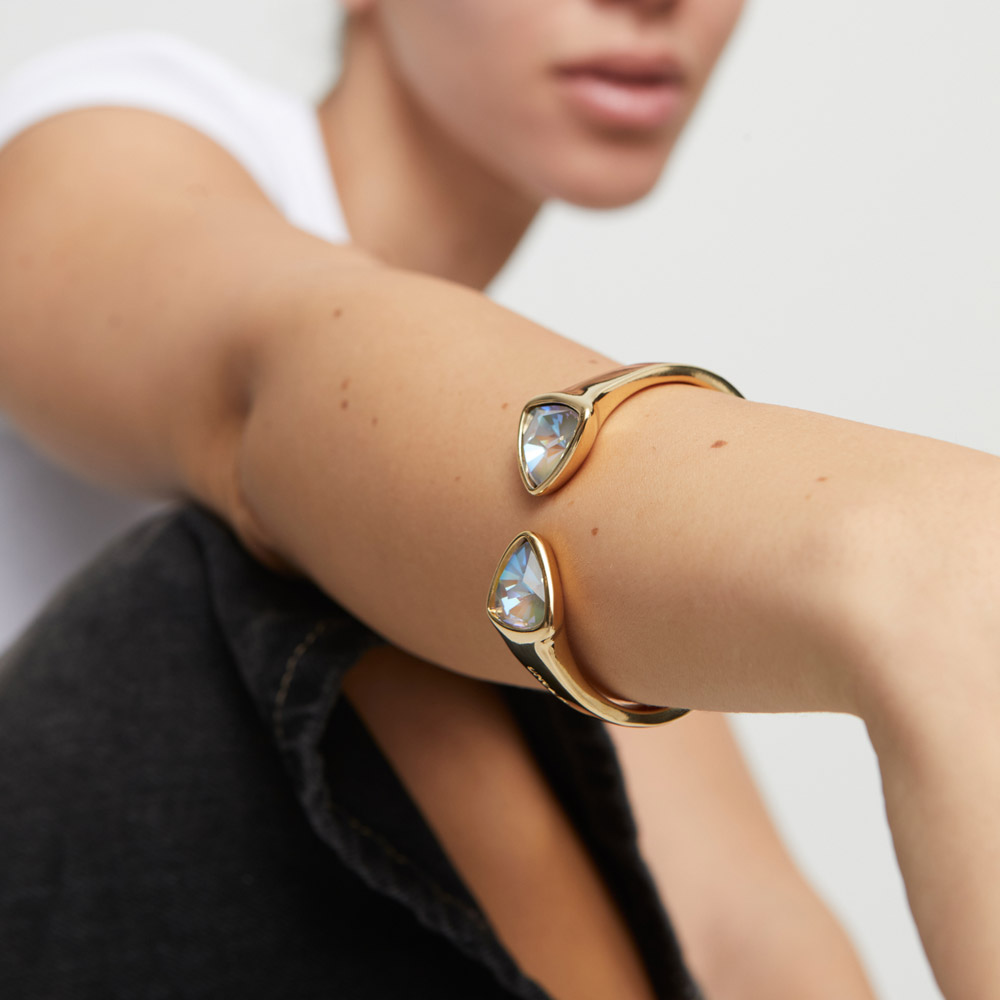 Браслет Ser Camaleonica — как солнечный шепот на коже, как драгоценный свет, заключённый в золотую оправу. Его кристаллы-хамелеоны переливаются, словно капли заката, меняя оттенки от тёплого мёда до нежного розового света — в такт движению, настроению, дыханию дня. Золотые элементы придают украшению благородное сияние, подчёркивая магическую игру цвета. Это не просто браслет, а амулет перемен, отражающий твой внутренний мир, твою лёгкость, женственность и силу. Надень его — и пусть каждый момент станет волшебным.