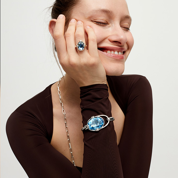 Жесткий браслет Ser Deslumbrante с голубым кристаллом словно заключает в себе отражение ясного неба в летний день. Голубой кристалл переливается мягкими оттенками лазури и аквамарина, притягивая взгляд и создавая ощущение свежести, легкости и гармонии. Его сияние добавляет образу воздушности и утонченности.