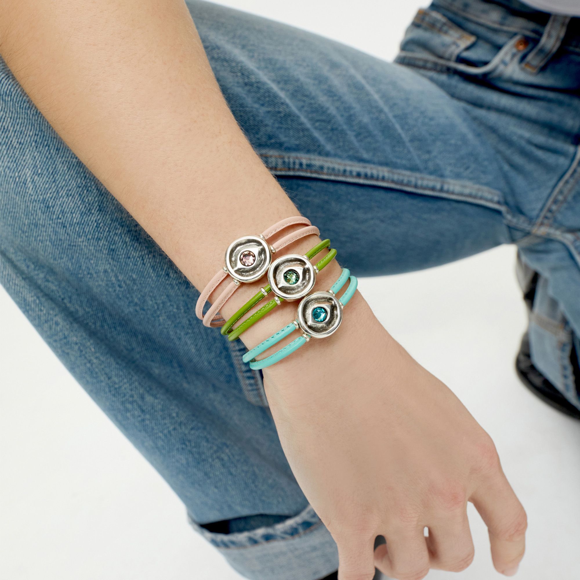 Кожаный браслет глаз Ser Intuitiva с бирюзовым кристаллом и серебряным напылением — это украшение, в котором бушует свобода ветра и пульсует желание раздвинуть горизонты.