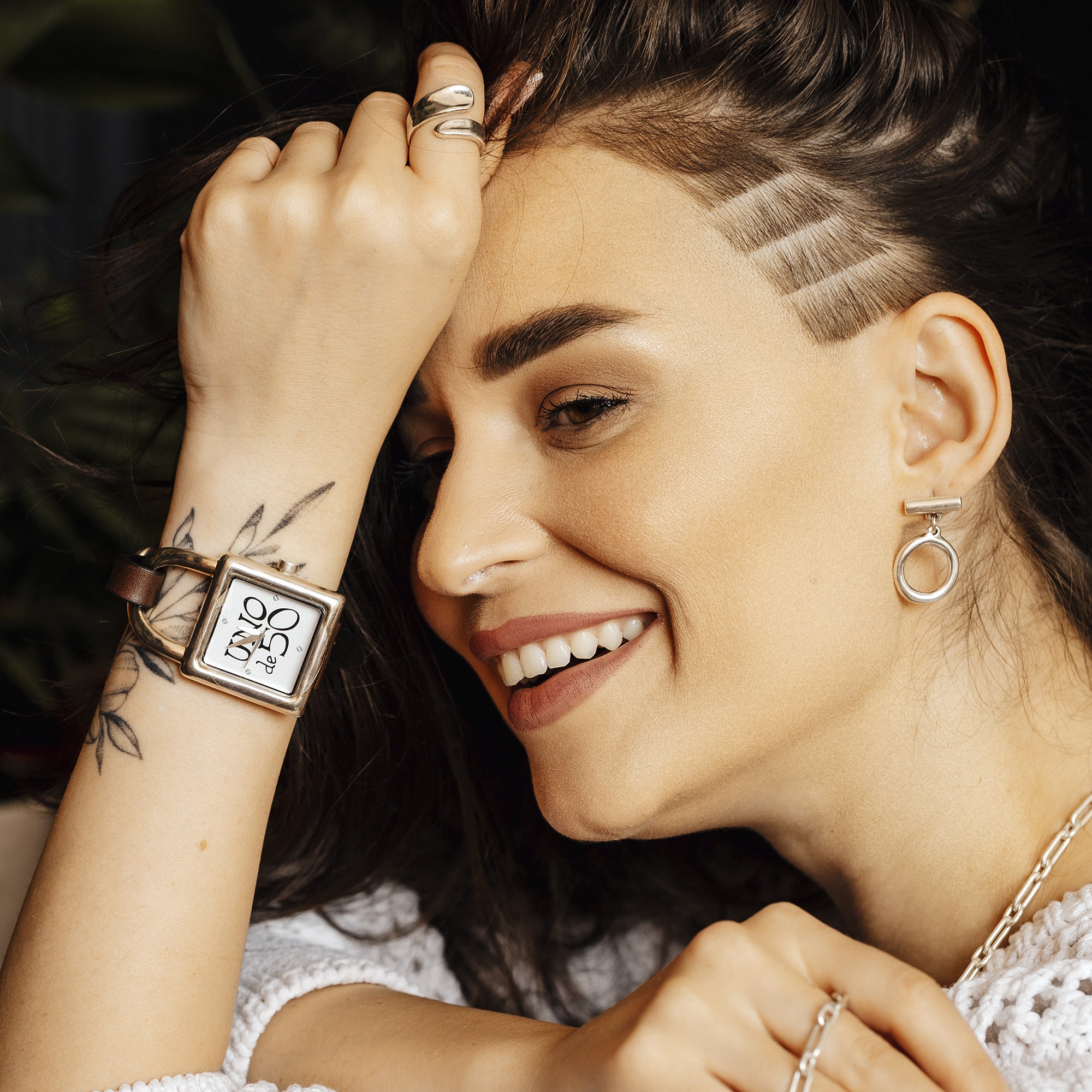 Женские часы с кожаным ремешком и квадратным корпусом из металлического сплава с серебряным покрытием. Водонепроницаемый корпус ручной работы. Механизм марки Citizen. Кварцевое стекло и регулируемый браслет ручной работы.