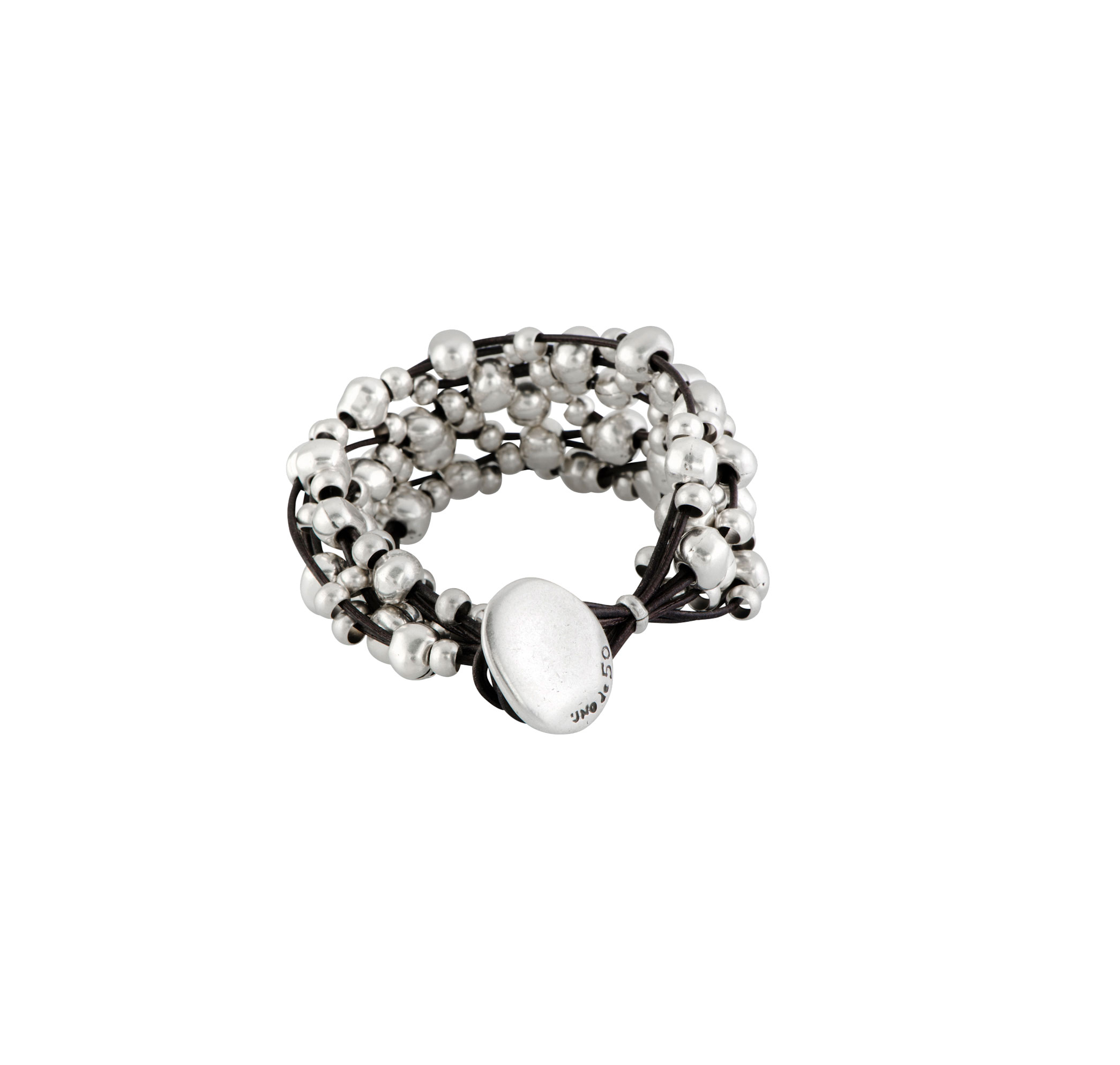 Женский браслет с несколькими рядами кожаных нитей, украшенных бусинами из металлического сплава с серебряным покрытием.