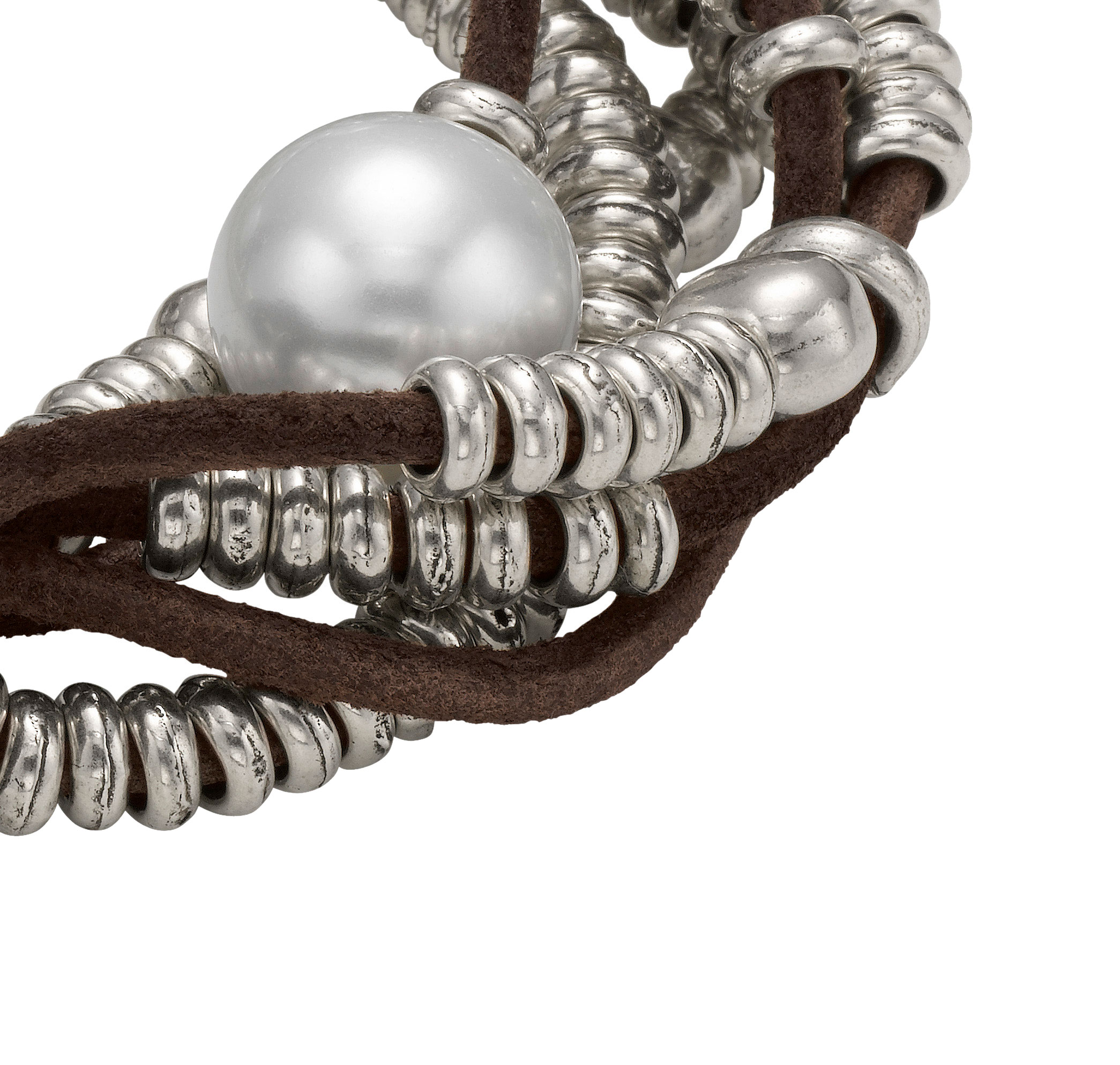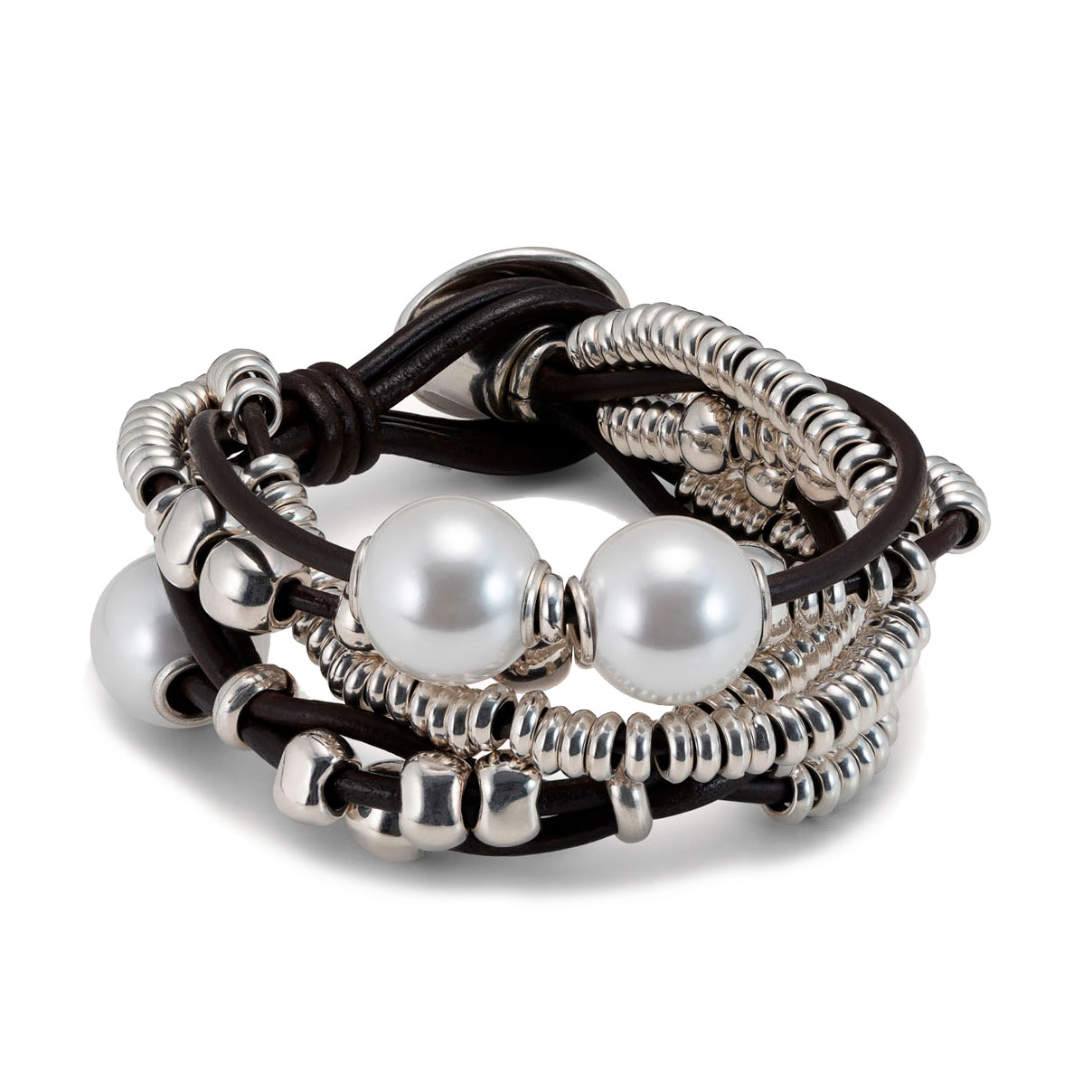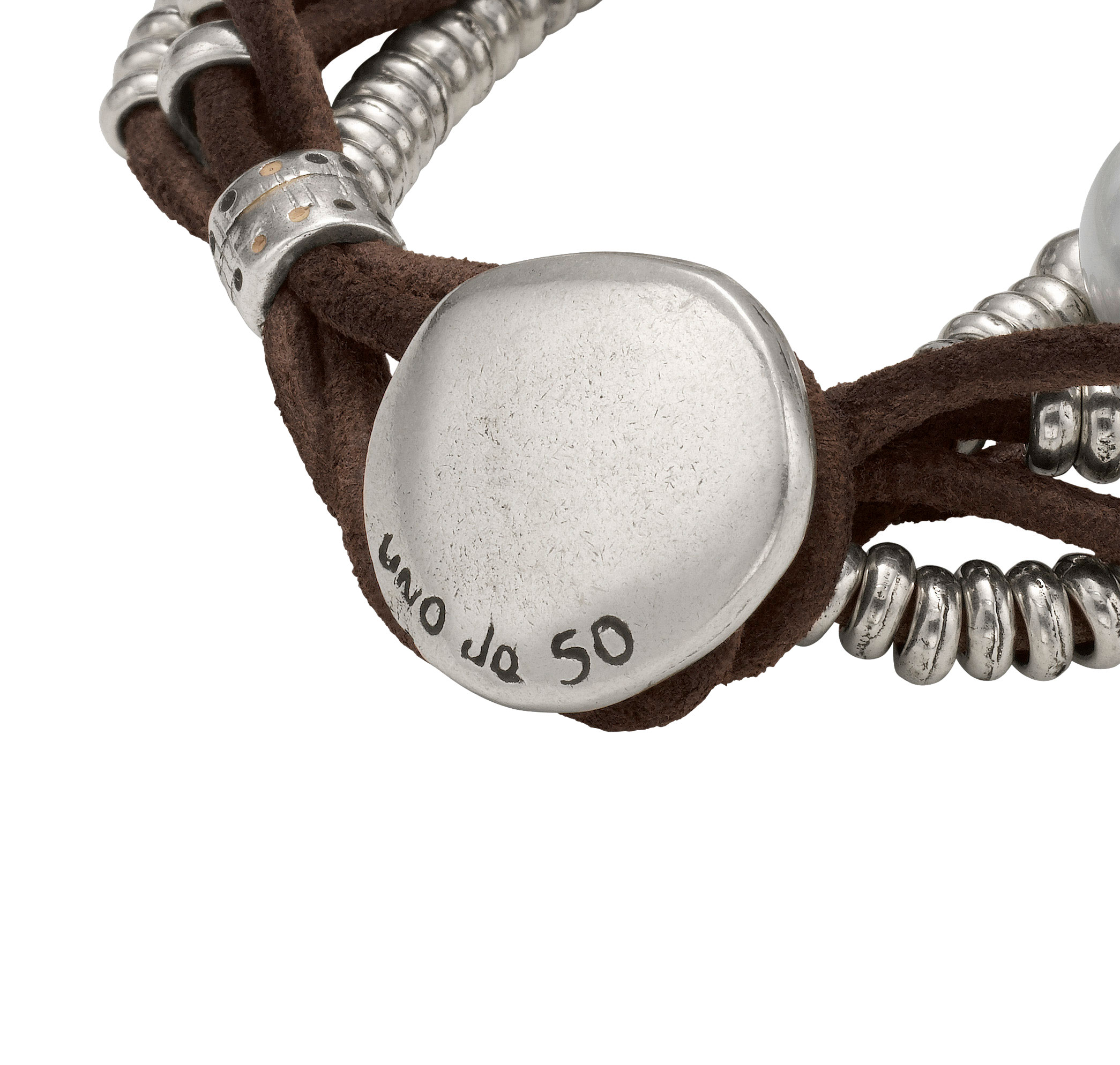 Женский браслет, состоящий из нескольких рядов кожаных нитей с жемчужинами и посеребренными бусинами. Застежка с наименованием бренда UNOde50.