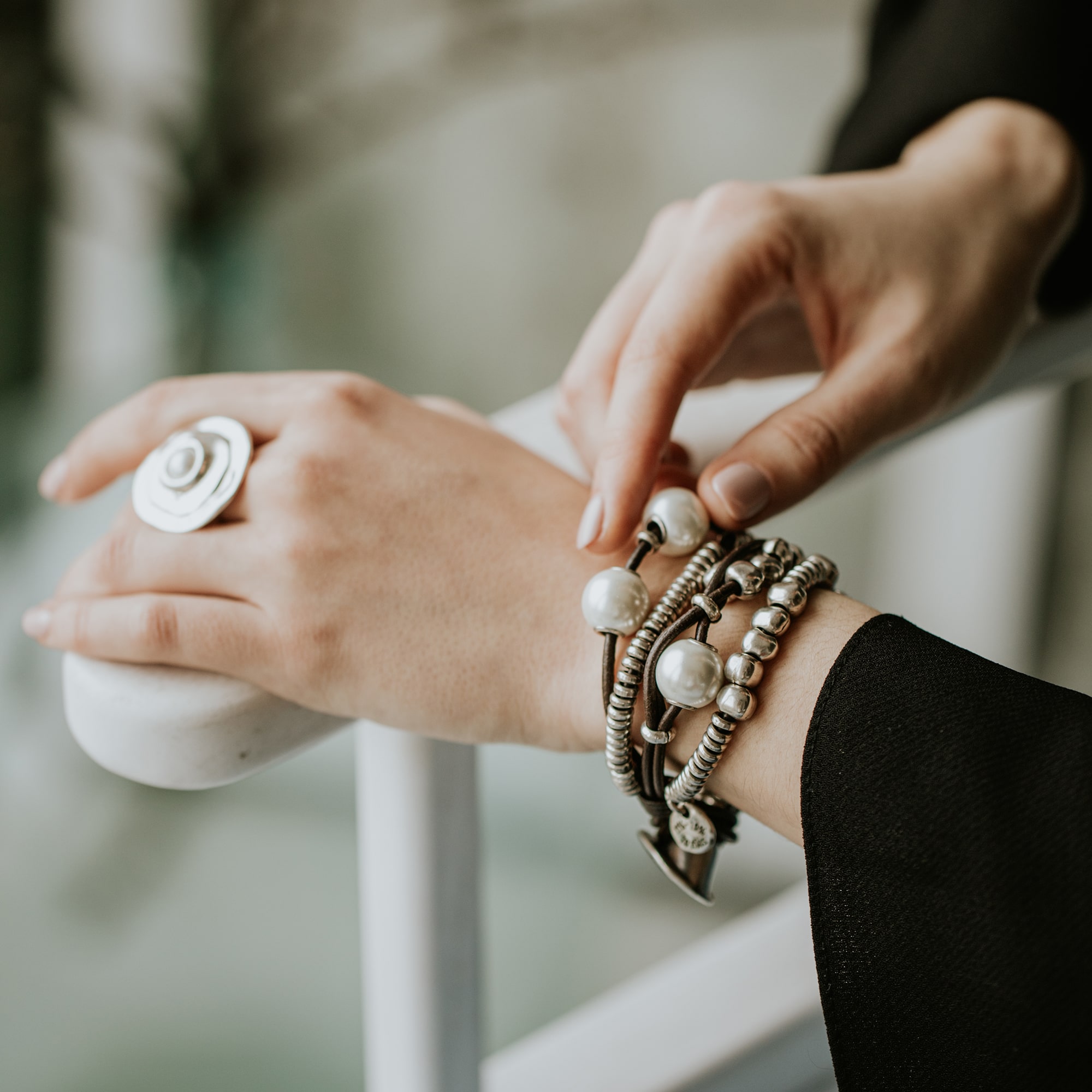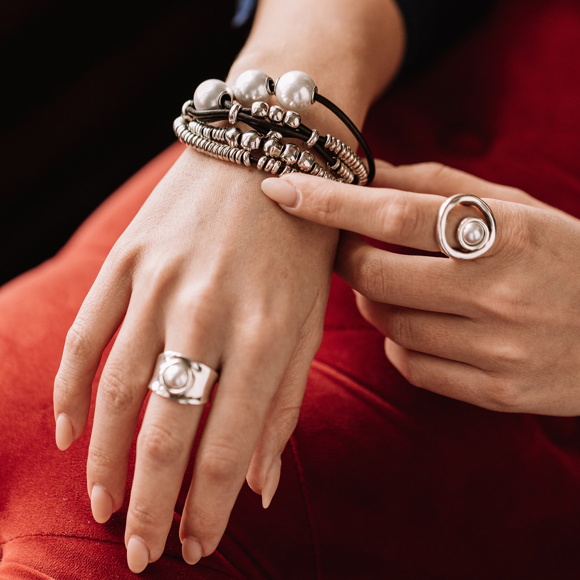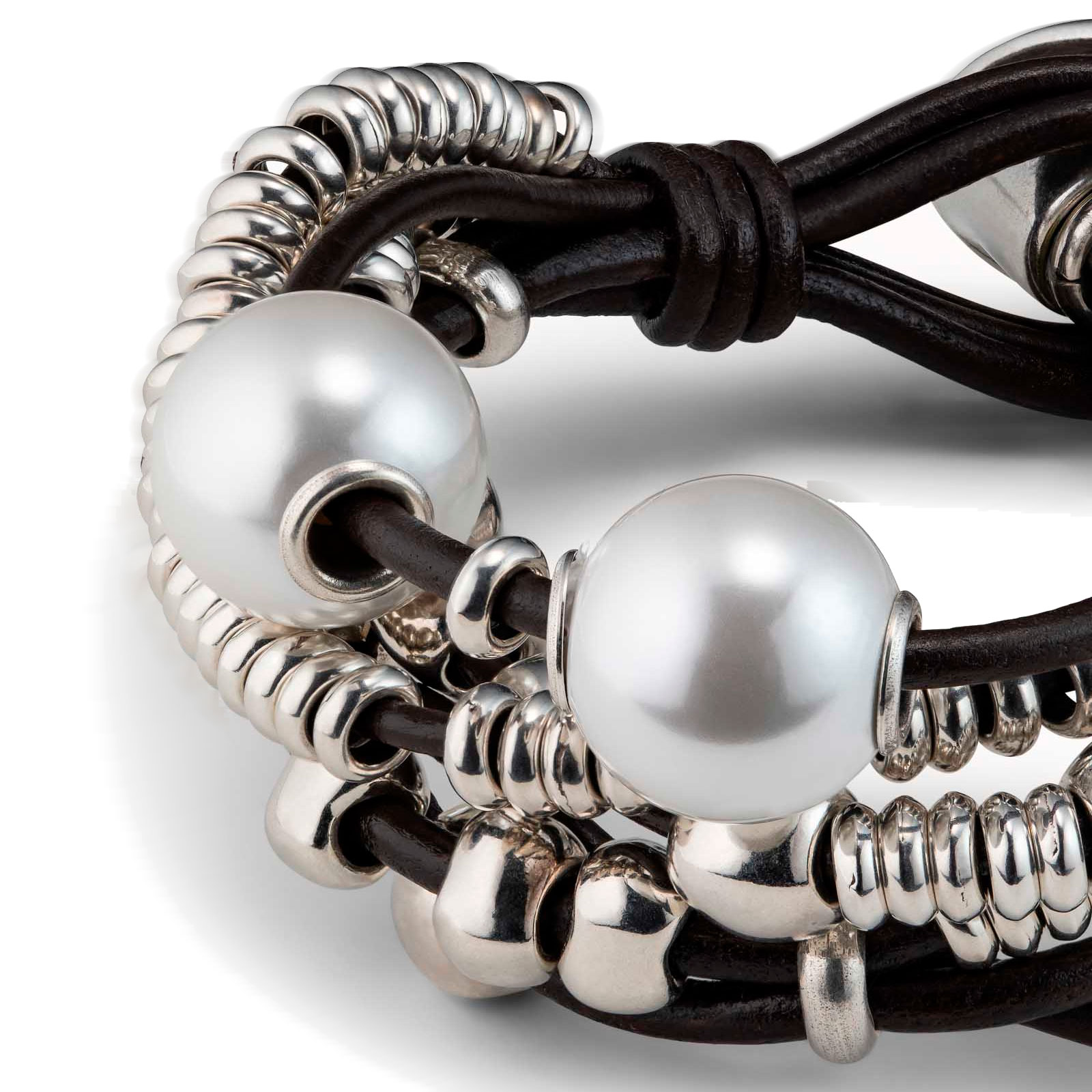 Женский браслет, состоящий из нескольких рядов кожаных нитей с жемчужинами и посеребренными бусинами. Застежка с наименованием бренда UNOde50.