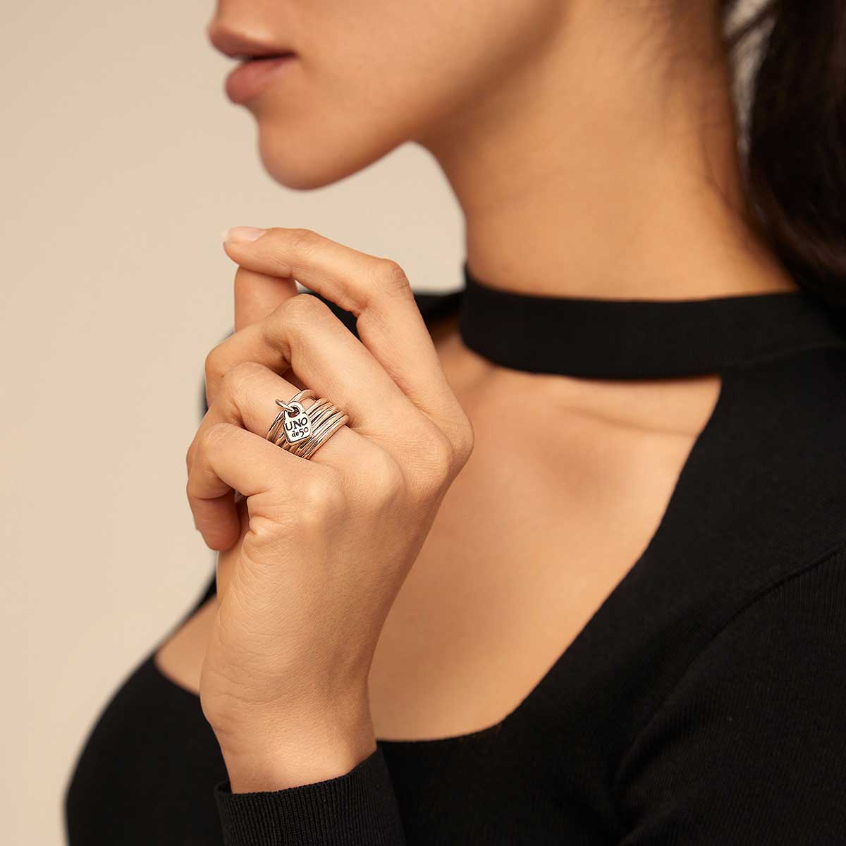 Составное женское кольцо «Prisoner» арт. ANI0057METXL представляет собой массивное украшение актуального дизайна, дополненное фирменным висячим замком с гравировкой бренда UNOde50. Крупное изделие привлечет внимание окружающих к вашему образу, став его главным элементом. Кольцо можно носить, распределяя его части так, как вам хочется. Украшение выполнено из высококачественного сплава металлов ZAMAK.