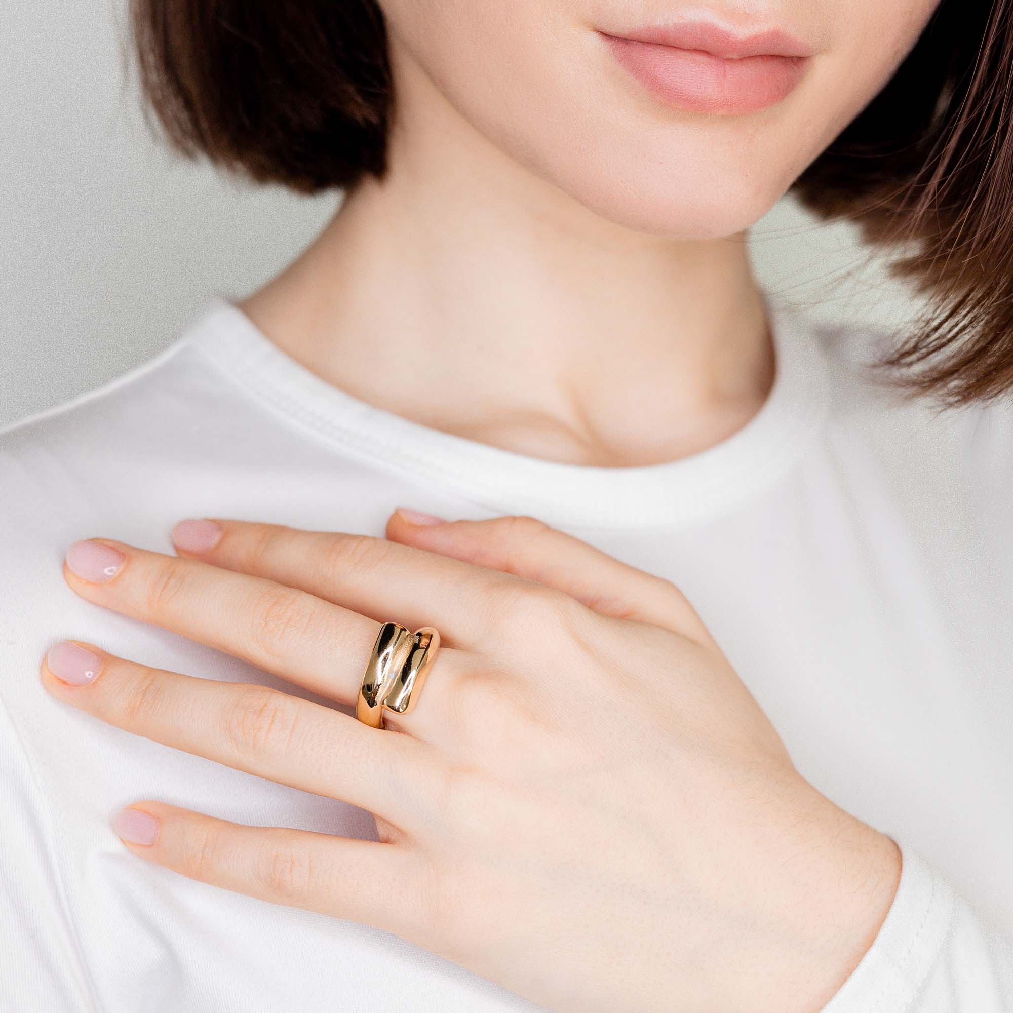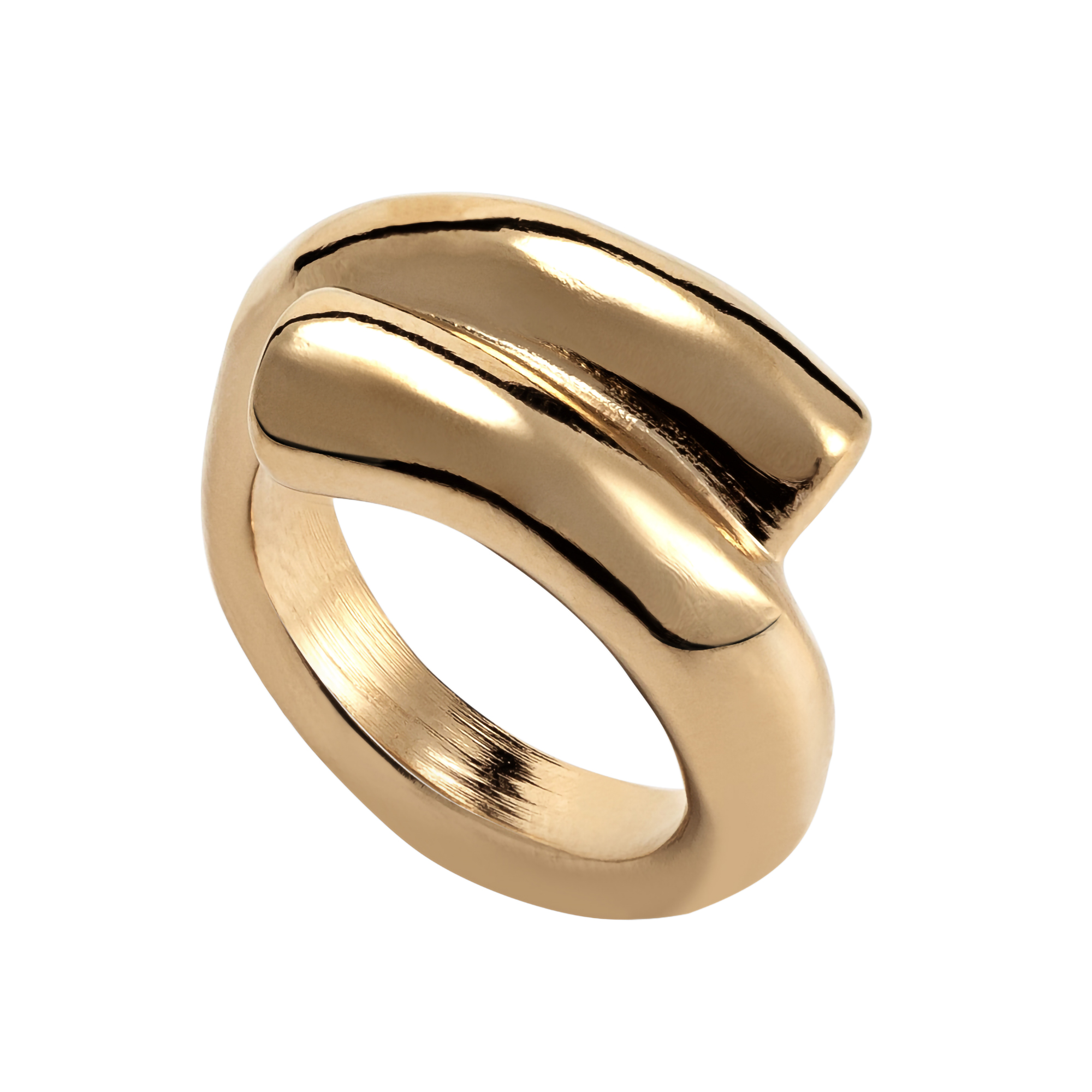 Кольцо в виде двух заполненных трубок, находящих одна на другую. Это кольцо изготовлено вручную в Испании с использованием ремесленных техник - от литья из металлического сплава ZAMAK до покрытия золотом в 3 микрона, вес кольца 11 г. Универсальный дизайн позволяет носить это кольцо с другими предметами из разных коллекций.
