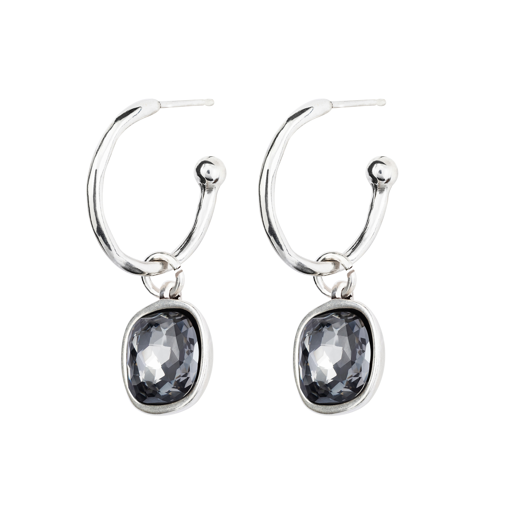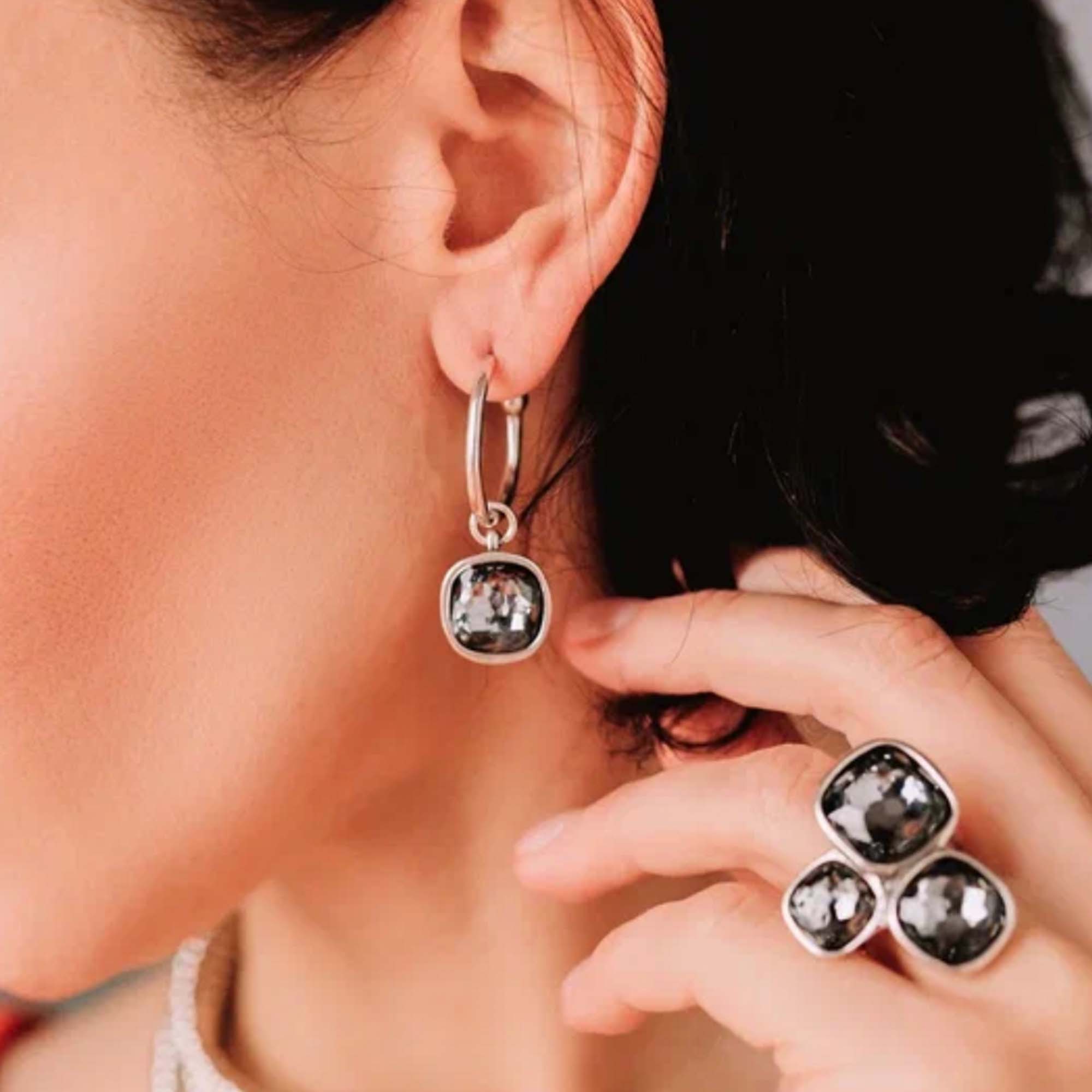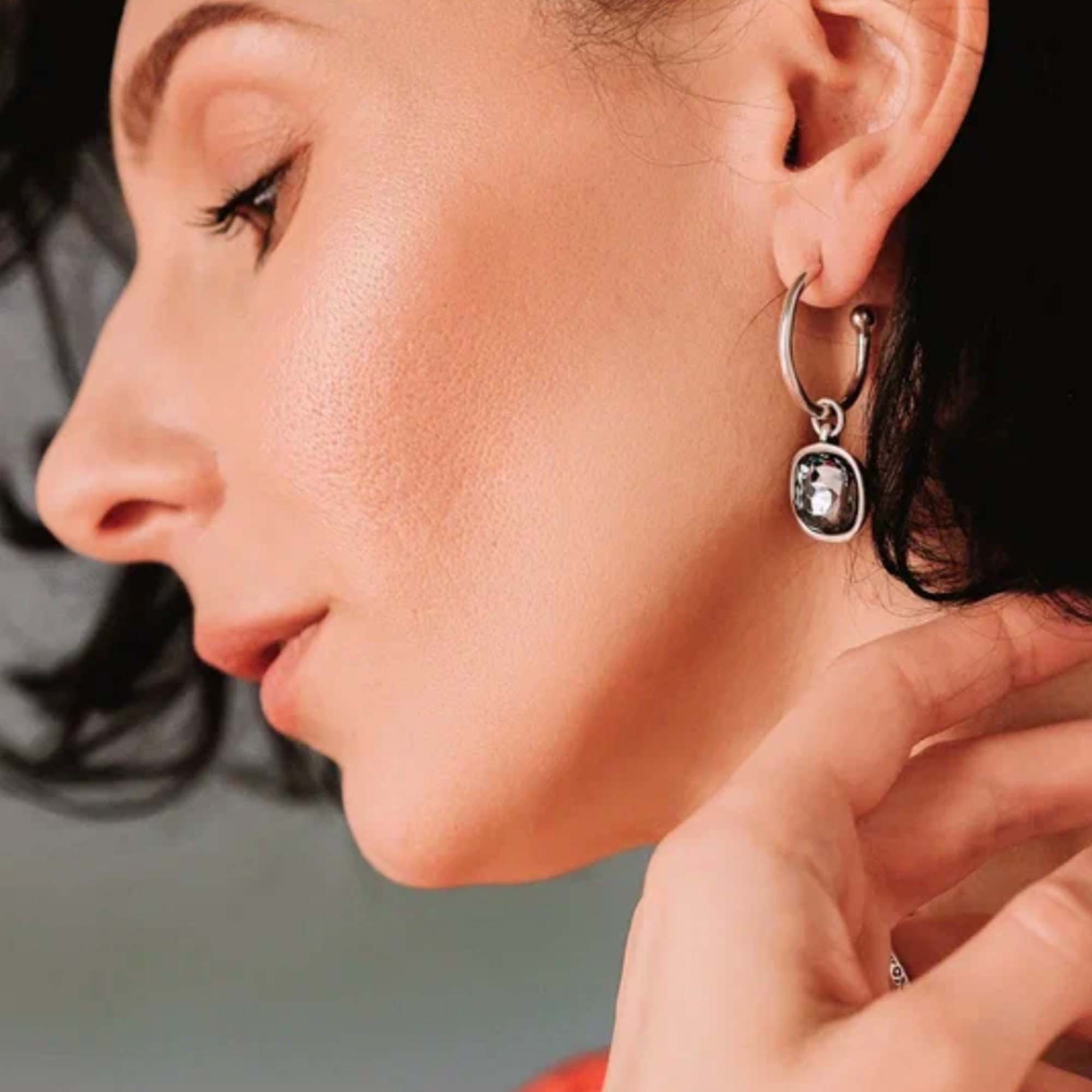 Серьги представляют собой открытые кольца с подвеской из съемного серого кристалла. Изготовлено вручную в Испании с помощью ремесленного процесса с использованием металлического сплава ZAMAK с посеребрением в 15 микрон. Они имеют диаметр 4 см и весят 5,8 г. Носите эти серьги с другими изделиями из коллекции Fearless, и вы обязательно вскружите всем головы.