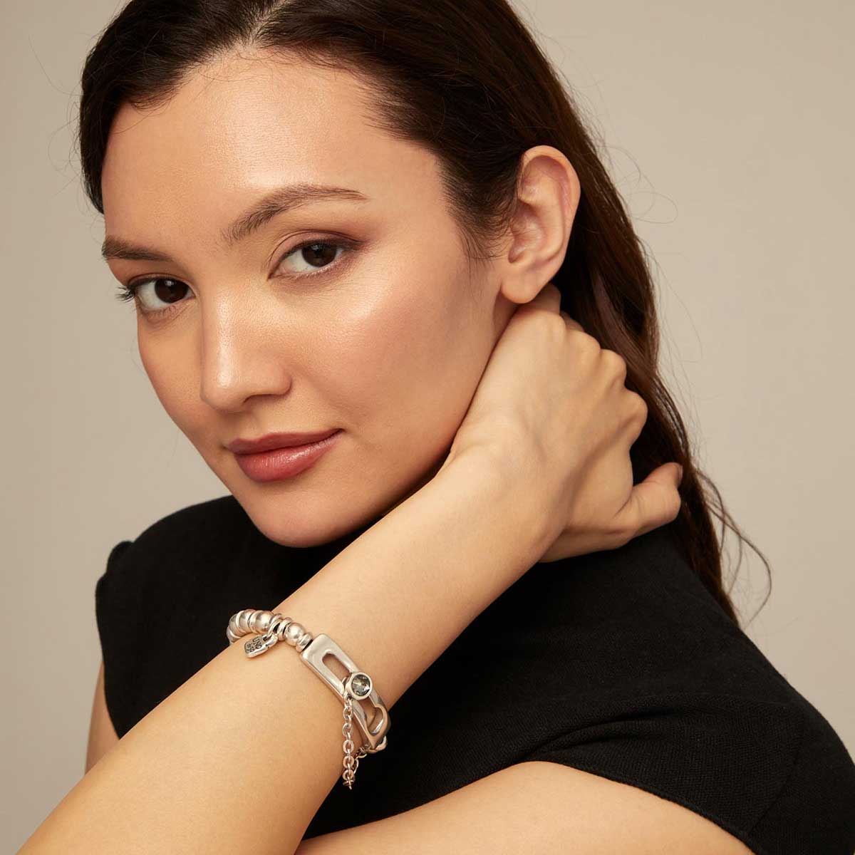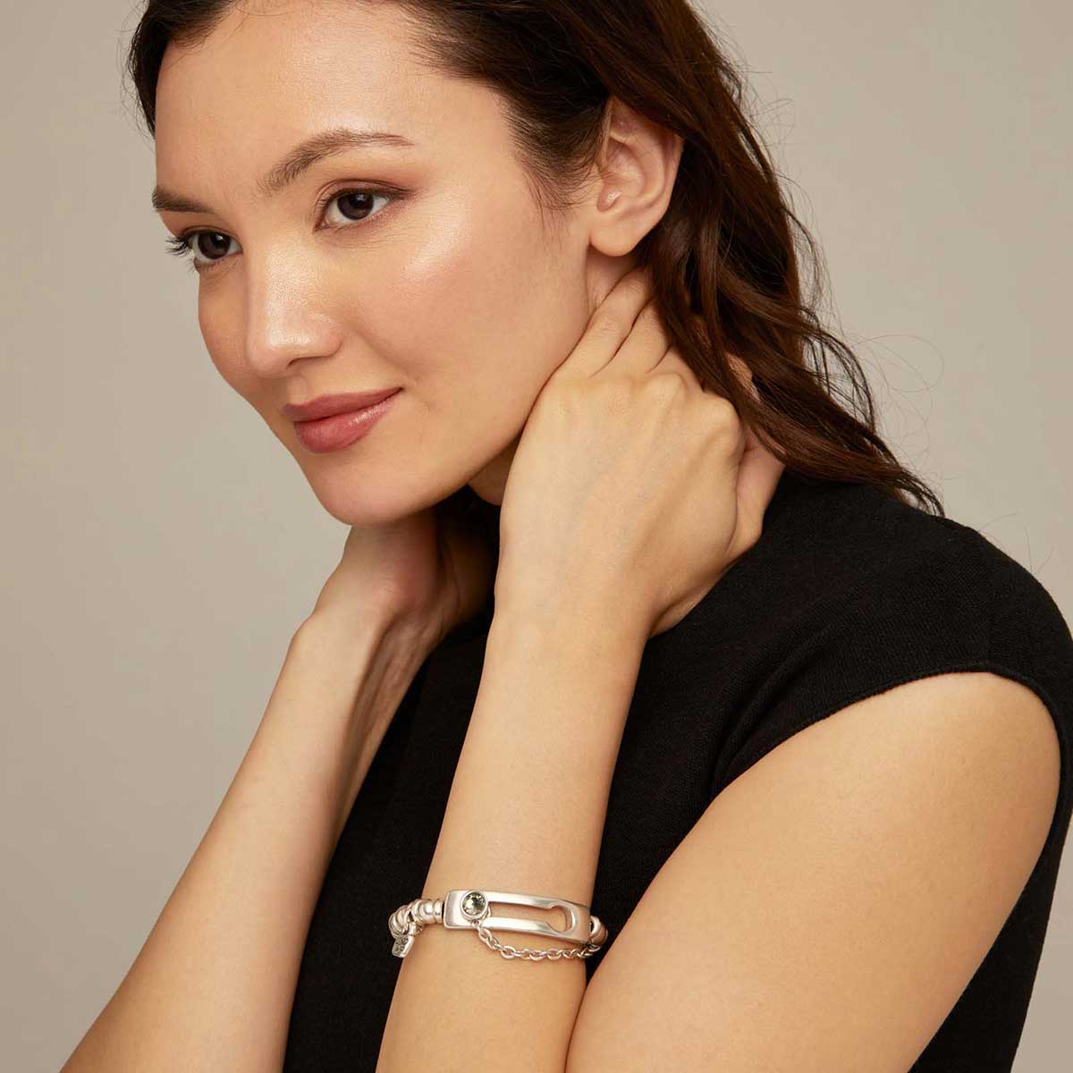 Дизайнерский браслет EMPOWER с серебром арт. PUL2369GRSMTL из коллекции INDEPENDENT — уникальное украшение, гармонично соединяющее множество элементов. Изготовленные из сплава ZAMAK бусины, которые составляют основу аксессуара, словно невероятные жемчужины, соединены со своими раковинами. С шарообразной формой бусин контрастирует центральный элемент в виде вытянутого прямоугольного звена, украшенный крупным серым кристаллом и небольшой цепочной. Замочек с фирменной символикой завершает эту невероятную композицию. Надевая этот браслет ручной работы, позвольте себе быть разной, быть стильной, быть независимой. Расширяйте границы, будьте собой! Бросьте вызов обыденности, дополнив браслет ожерельем COL1875GRSMTL, чтобы завершить образ.