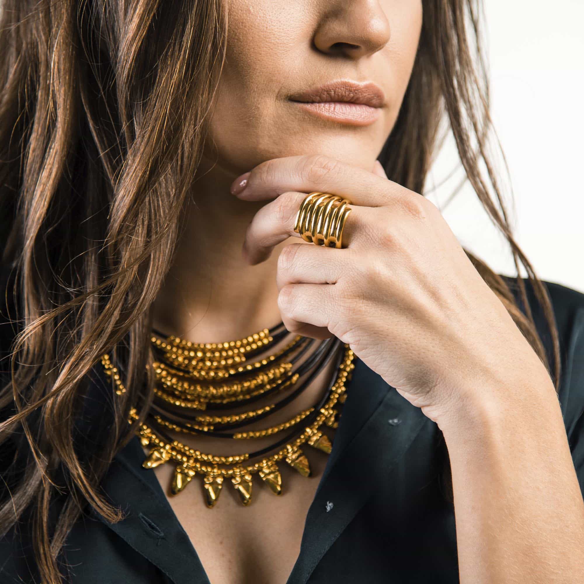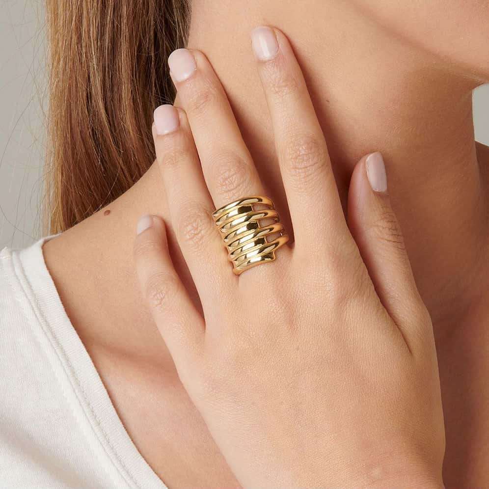 Дизайн построен на повторяющихся изогнутых линиях, которые оборачиваются вокруг пальца, создавая эффект движения и плотного объема. Слои плавно переходят друг в друга, формируя цельную конструкцию без разрывов. Гладкая полированная поверхность усиливает игру света и подчеркивает рельеф изделия.