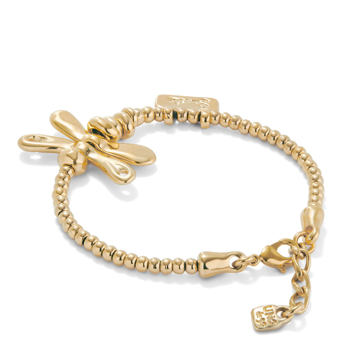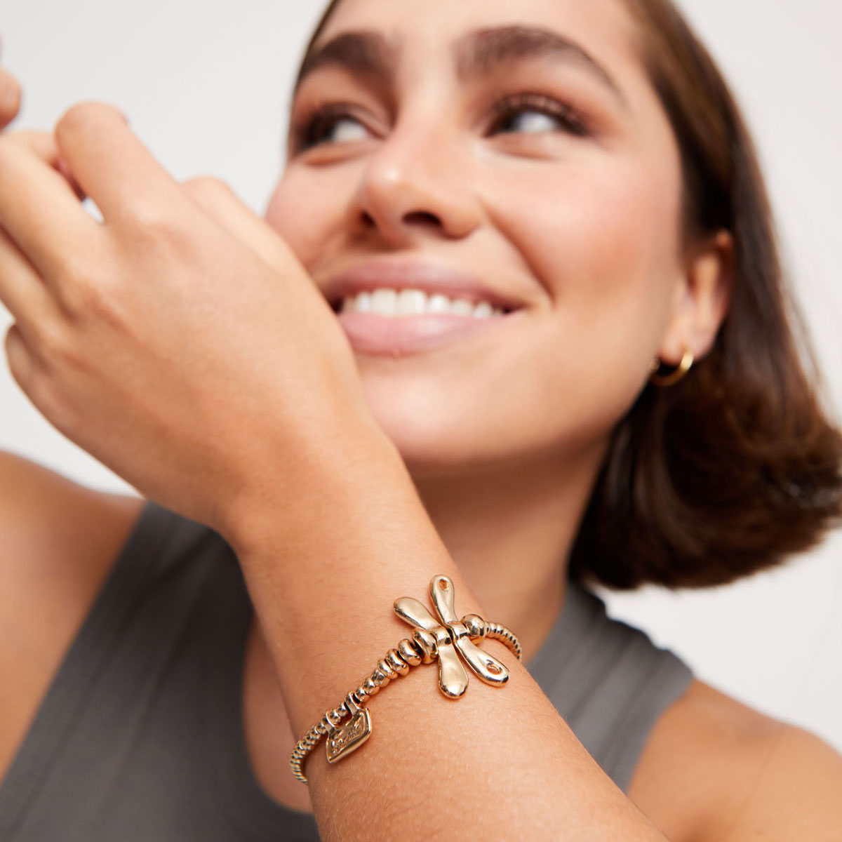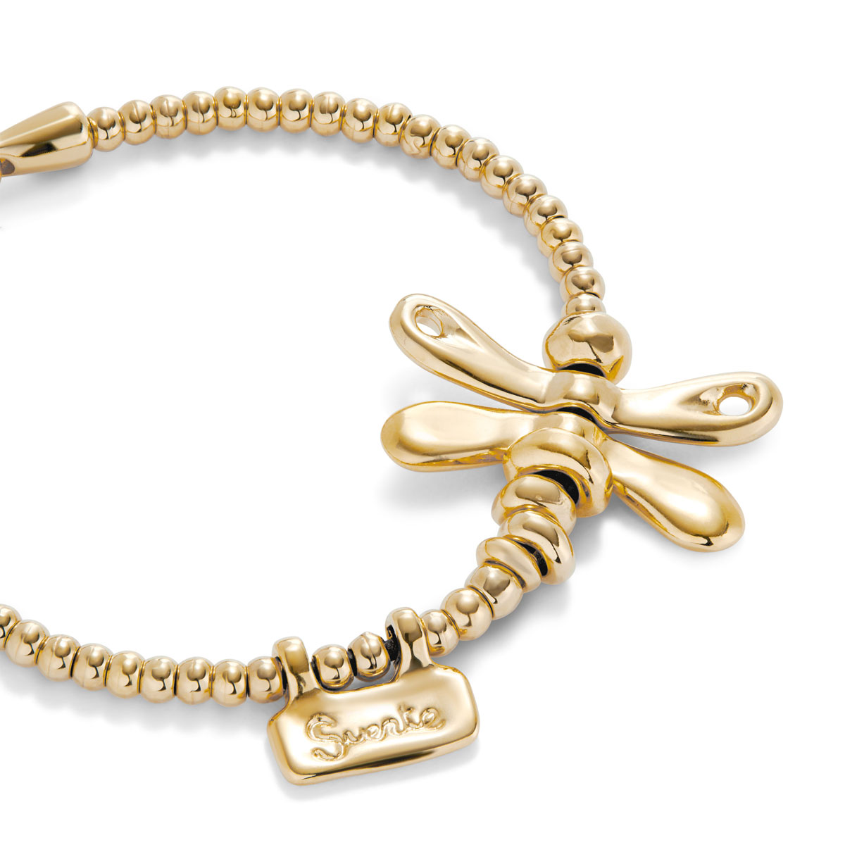 Наслаждайтесь беззаботностью и ощущением легкости с эластичным браслетом со стрекозой, с золотом, арт. PUL2477ORO000 из коллекции SER REBELDE. Изделие, выполненное из металлических бусин, венчает центральный элемент в виде стрекозы с распахнутыми крыльями. Дополнительным украшением является планка с гравировкой, которая может стать основой вашей ежедневной аффирмации, ведь нанесенное слово Suerte переводится с испанского как «удача». Надевая каждый день браслет, произносите: «Удача со мной» и будьте уверены, что она теперь сопровождает вас повсюду. Этот аксессуар ручной работы из уникального сплава ZAMAK станет не только впечатляющим украшением для любого образа, но и талисманом, приносящим везение.