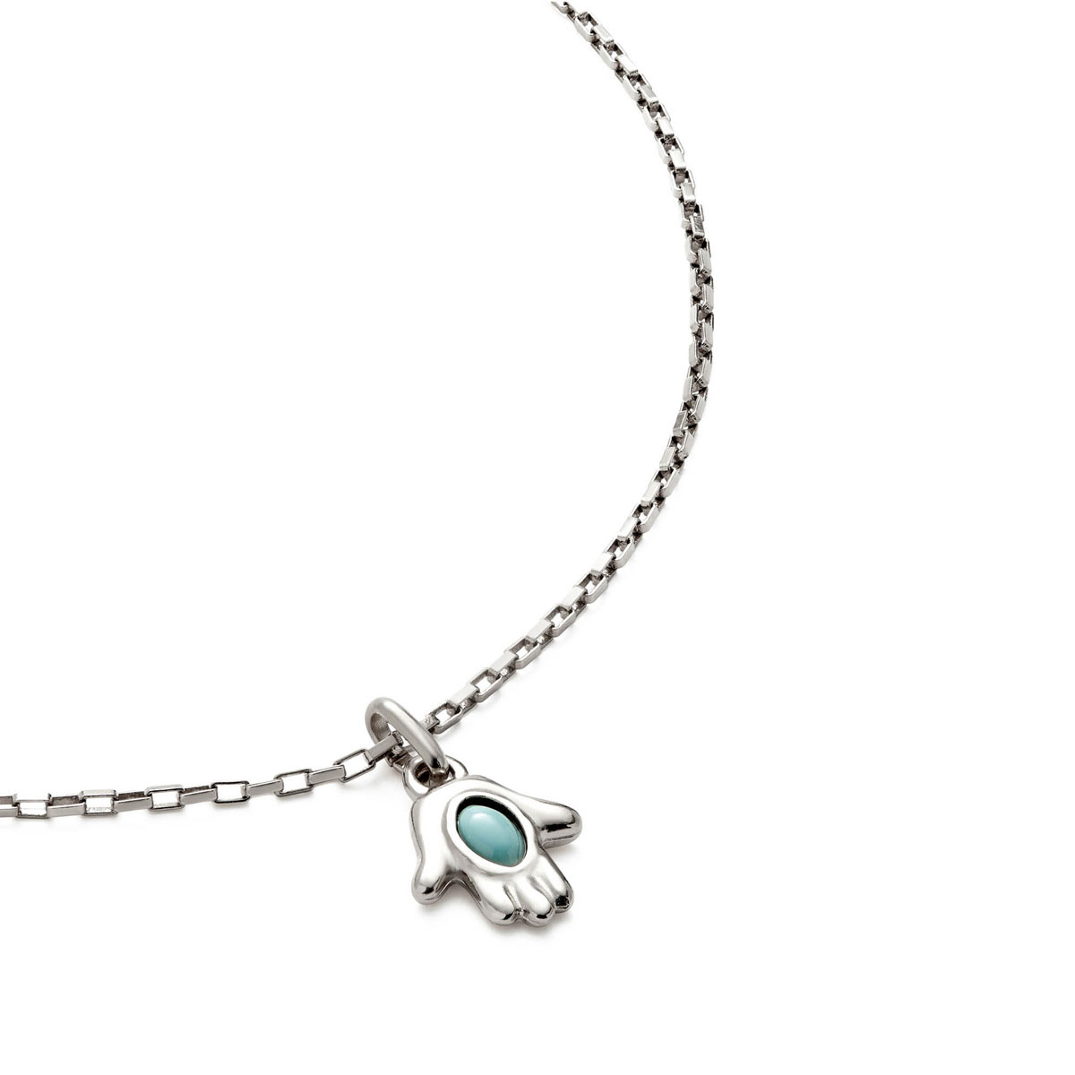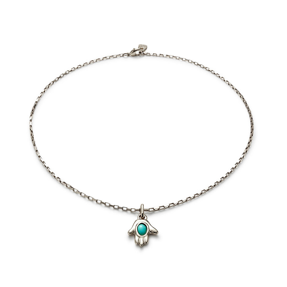 Культовое ожерелье с подвеской в форме руки Фатимы, с серебром и бирюзой, арт. COL2016TQSMTL0U из коллекции SER UNICO станет не только эксклюзивным украшением, но и защитным талисманом. Знак раскрытой симметричной ладони используется во многих религиях мира и носит разные названия: Хамса, рука Бога, Божья десница. Но не смотря на разницу названий, этот символ везде трактуется одинаково: как защита и поддержка высших сил. Аксессуар представляет собой цепочку из прямоугольных звеньев, украшенную кулоном в виде знаковой ладони, центр которой декорирован бирюзой. Изделие ручной работы, изготовленное из уникального сплава ZAMAK, достойно стать неотъемлемой частью вашего образа, добавляющей ему магию символизма.