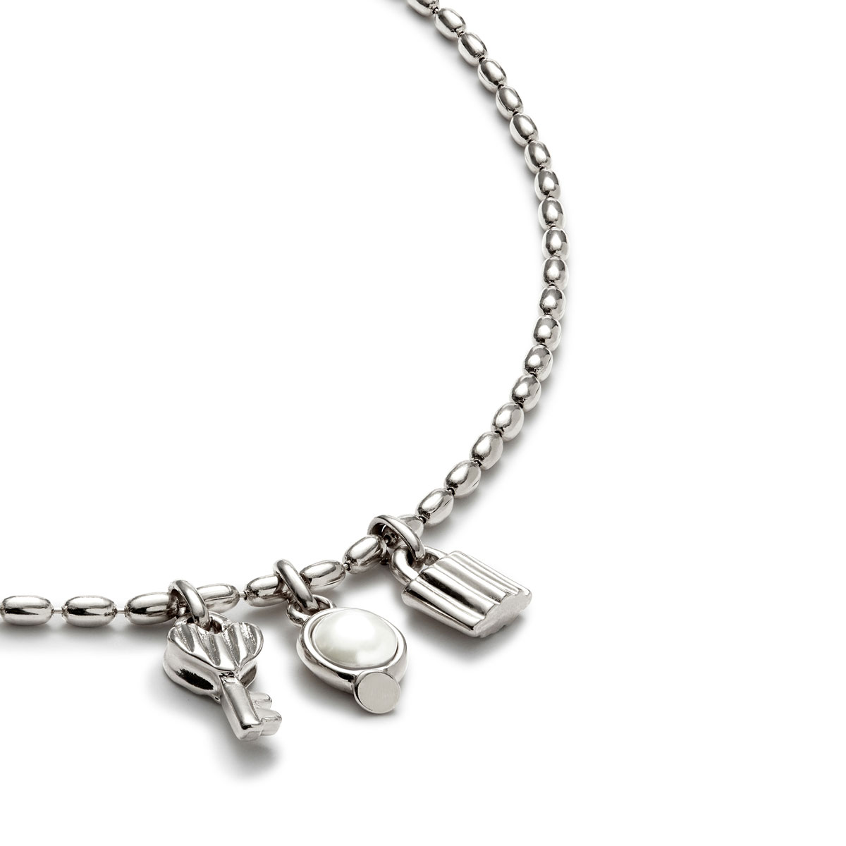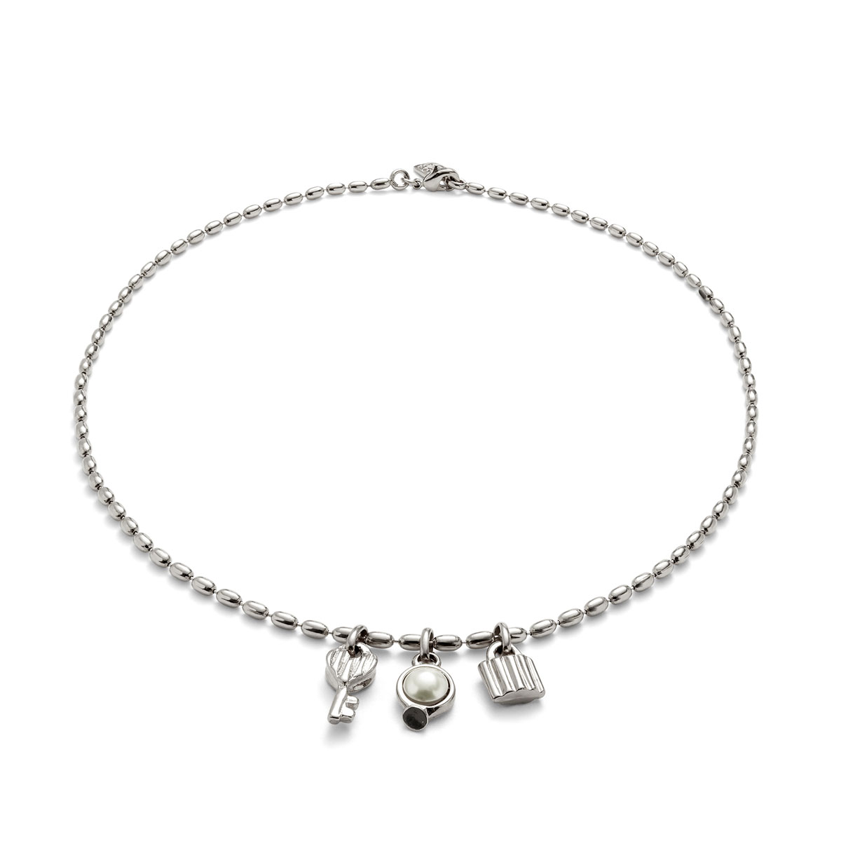 Ощутите притяжение загадочности ожерелья с тремя подвесками, с серебром и искусственным жемчугом, арт. COL2017BPLMTL0U из коллекции SER UNICO. Аксессуар представляет собой цепочку, собранную из продолговатых металлических бусин и украшенную сразу тремя кулонами, каждый из которых заслуживает внимания. Маленький замочек скрывает какую-то тайну. Ключ, чья верхняя часть, выполнена в форме сердца, сулит разгадку. Крупная искусственная жемчужина, заключенная в оригинальную оправу, символизирует любовь. Украшение ручной работы с фантазийным авторским дизайном, изготовленное из посеребренного сплава ZAMAK, станет эксклюзивным украшением, способным усилить магию вашей женственности и чувственности.