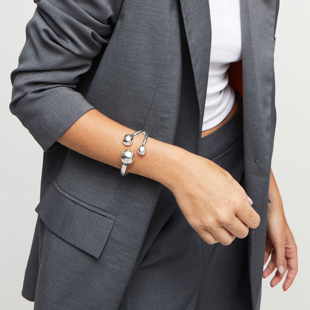 Проявите свое творческое начало с помощью браслета Ser Intrepida с серебром, арт. PUL2546MTL000. Неординарный авторский дизайн аксессуара, изготовленного вручную из уникального сплава ZAMAK, привлекает внимание и вызывает восхищение. Жесткий браслет состоит из плавных текучих линий, увенчанных тремя гладкими сферическими элементами. Футуристическая форма изделия создает ощущение, что это настоящее произведение искусства. Выбор такого аксессуара — идеальный способ раскрыть свою индивидуальность и продемонстрировать художественный вкус.