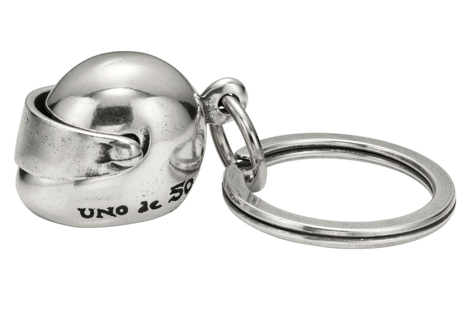 Посеребренный брелок с украшением в виде каски и выгравированным сбоку названием бренда UNO de 50.