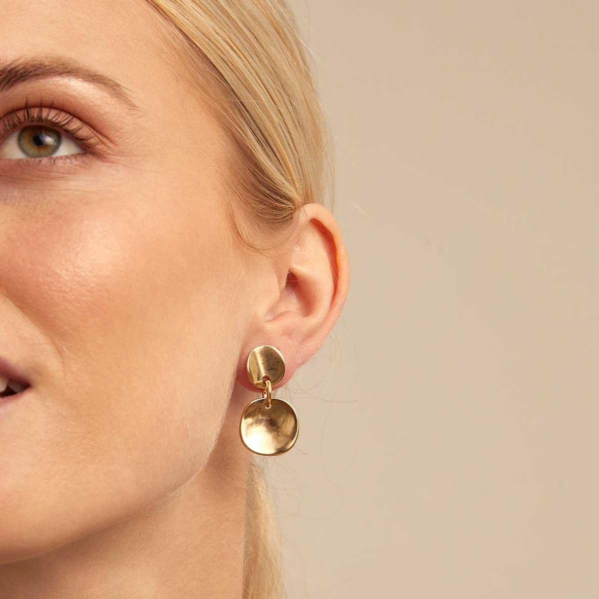 Стильные и притягательные крупные серьги ручной работы из коллекции знаменитого испанского бренда UNOde50 выполнены из металического сплава с золотым покрытием. Украшение представлено в виде двух плоских элементов круглой формы, соединенных позолоченным звеном. Модные женские серьги смотрятся эффектно с любым нарядом и будут прекрасно гармонировать с крупными браслетами и кольцами. Удобные и практичные застежки-пусеты не цепляют волосы. Сделано в Испании.