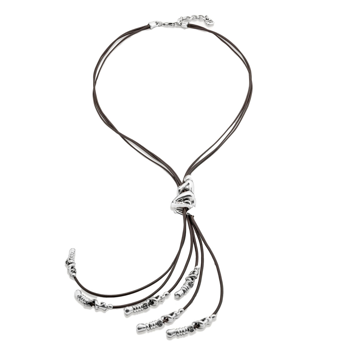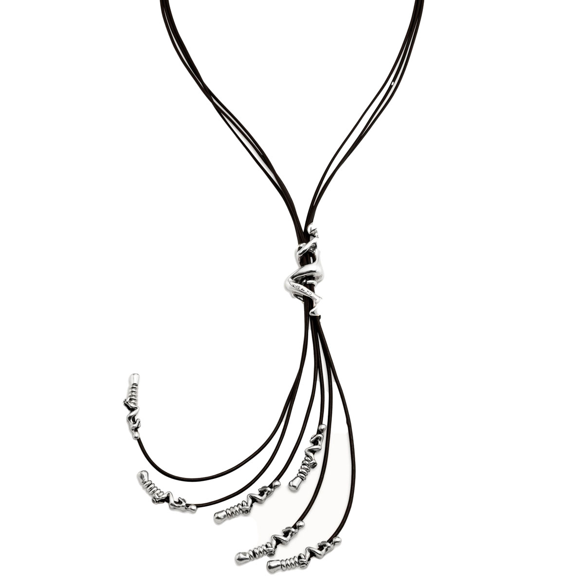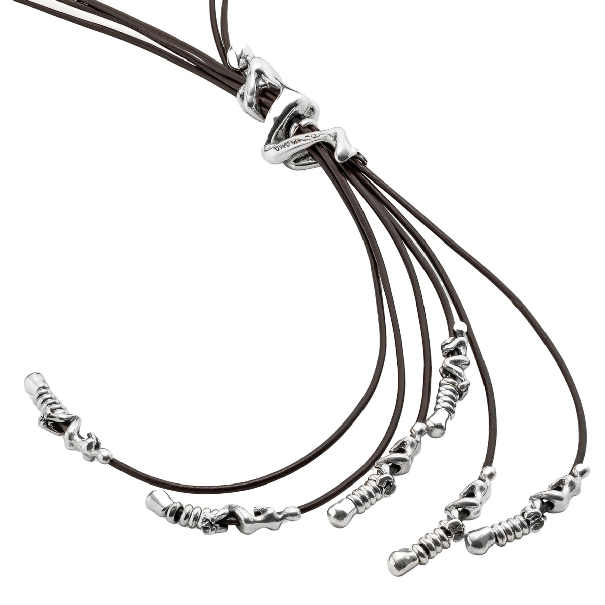 Длинное вызывающее ожерелье из темно-коричневых кожаных шнуров с оригинальными посеребренными деталями на концах. Креативный дизайн этого колье имеет оригинальную металлическую фигуру в центре, взбирающуюся по кожаным шнурам. Подвеска отражающает независимый характер драгоценностей ручной работы, созданных UNOde50. 100 % сделано в Испании.