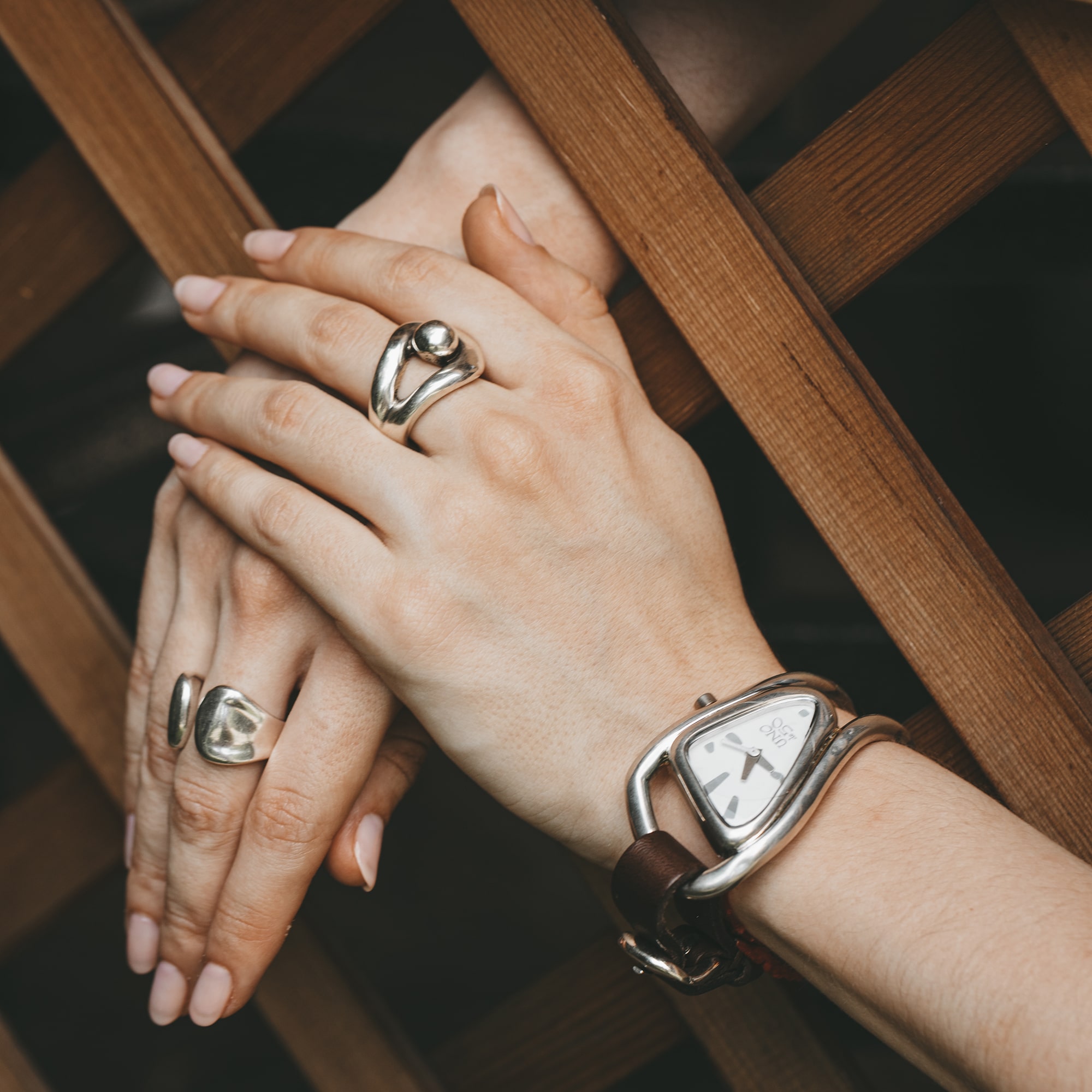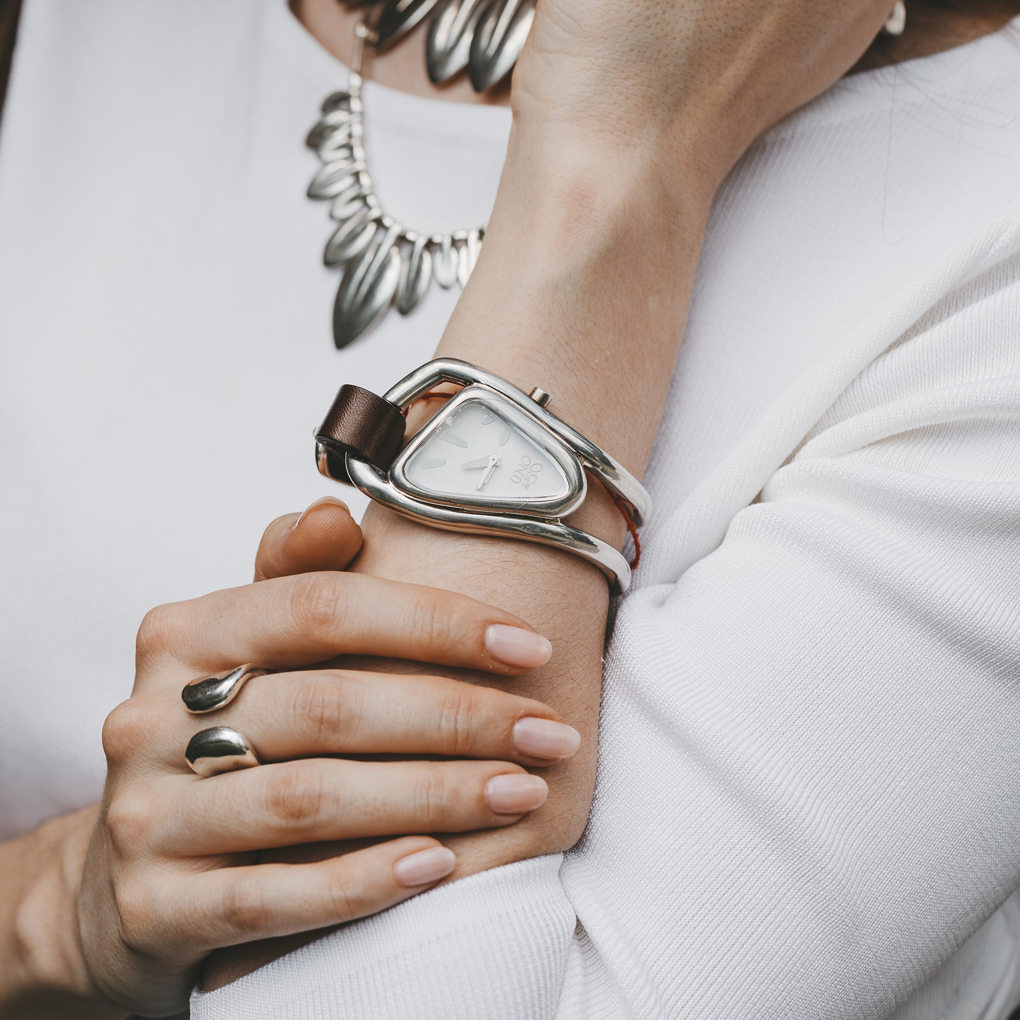 Часы "Din Don" с белым циферблатом и логотипом UNOde50 — это statement аксессуар, который будет актуален в любое время в любом образе. Часы выполнены на массивном металлическом браслете с регулирующимся кожаным ремнем. Фантазийный дизайн, изогнутые формы, необычный циферблат подчеркнут ваш неповторимый стиль. Это часы, которые могут быть самым настоящим украшением.