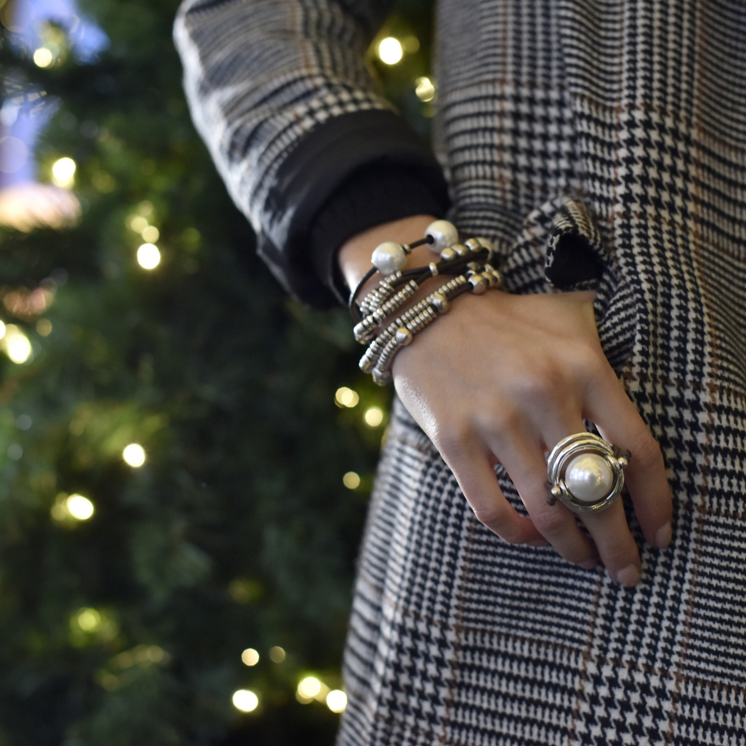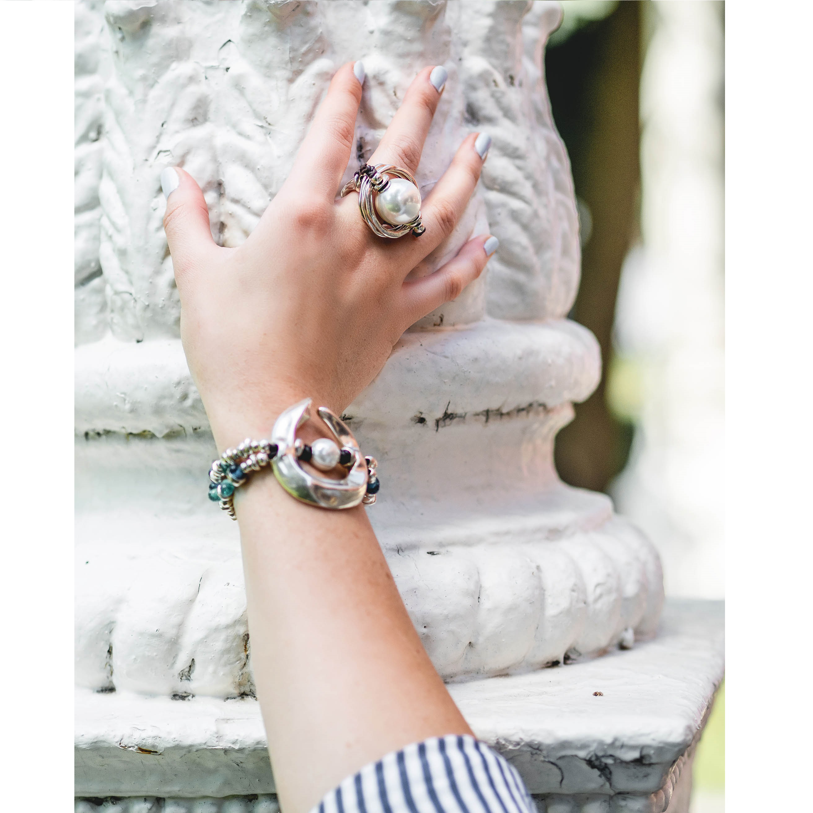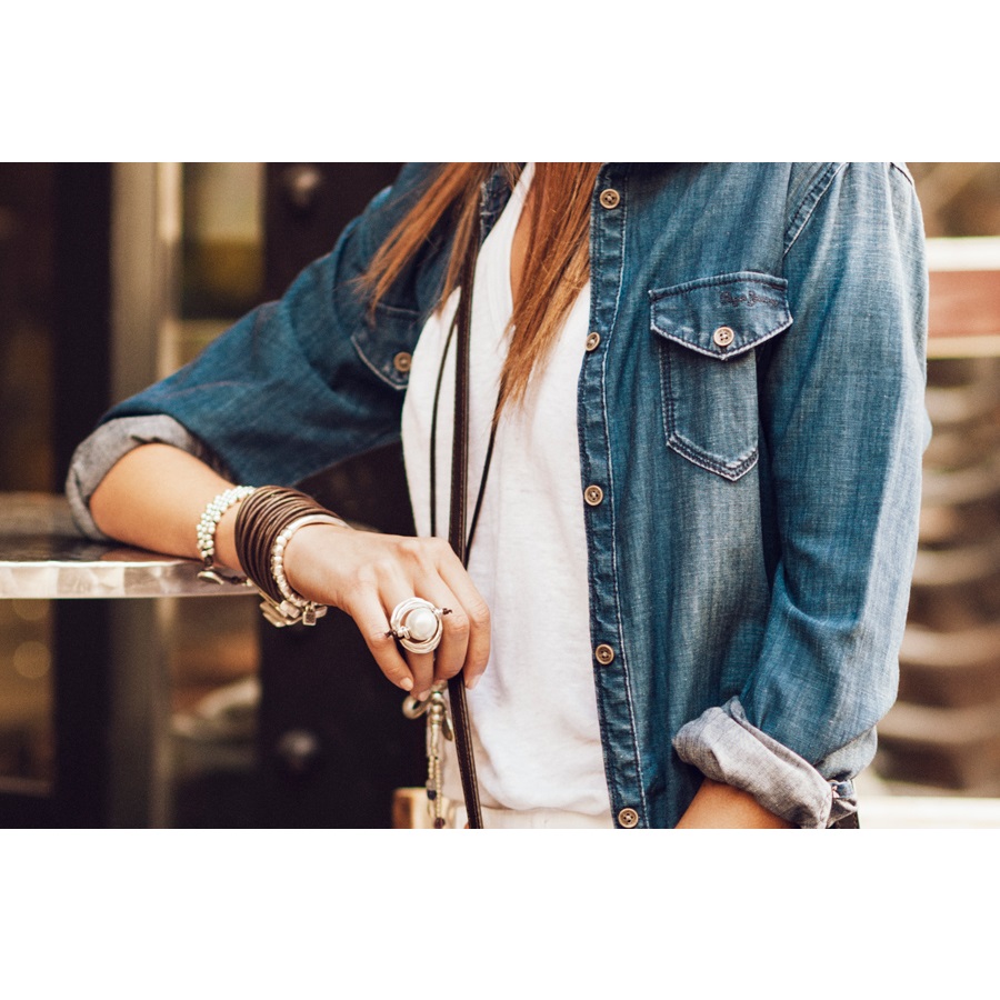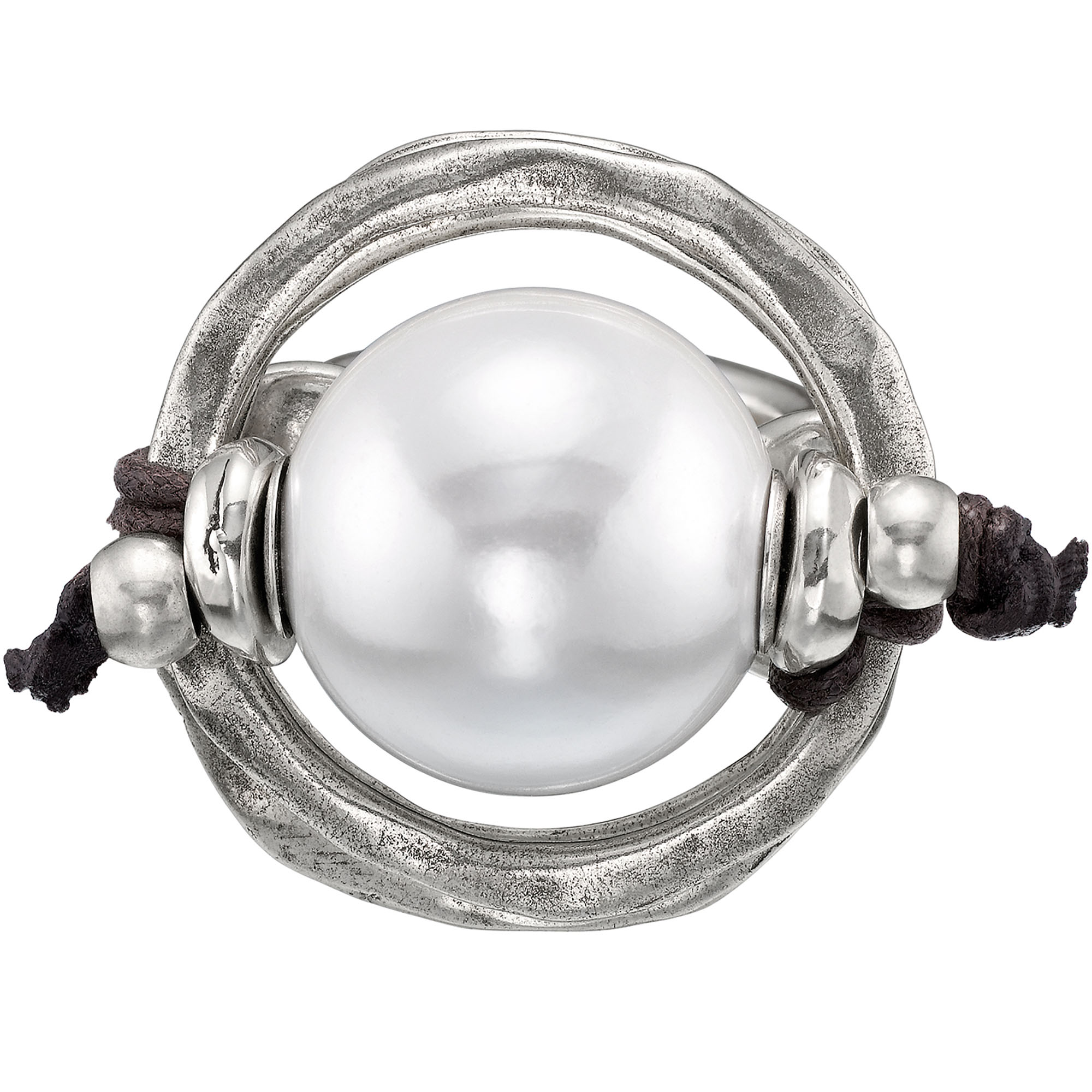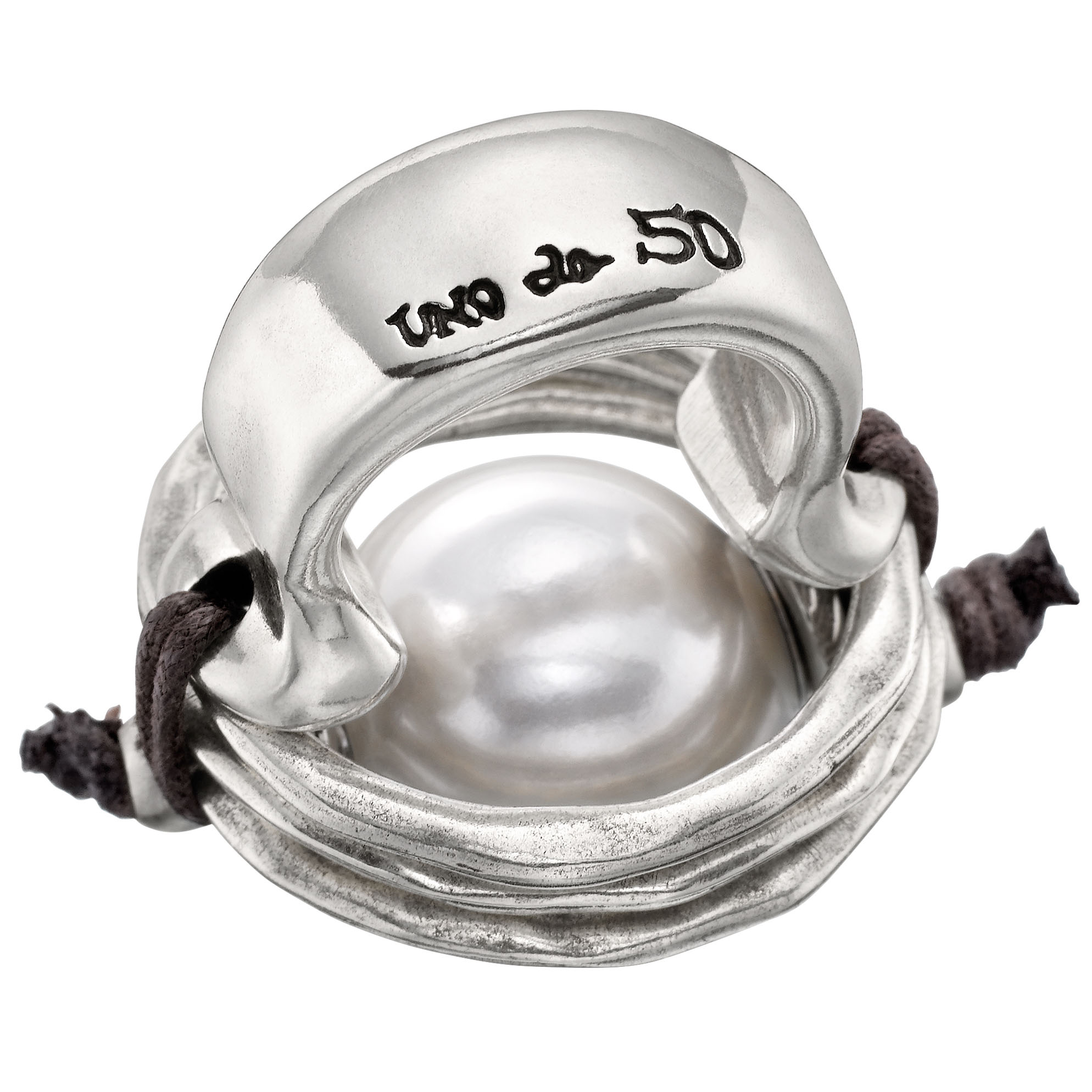 Металлическое кольцо с серебряным покрытием и большой искусственной жемчужиной посередине, закрепленной с помощью шнурочка из кожи. Выполнен в уникальном, ни с чем не сравнимом стиле UNOde50. 100% ручная работа, сделано в Испании.