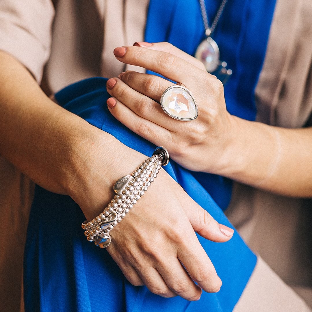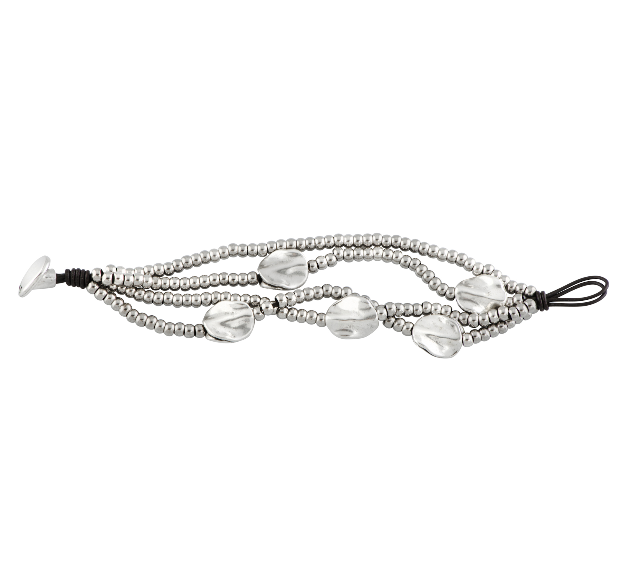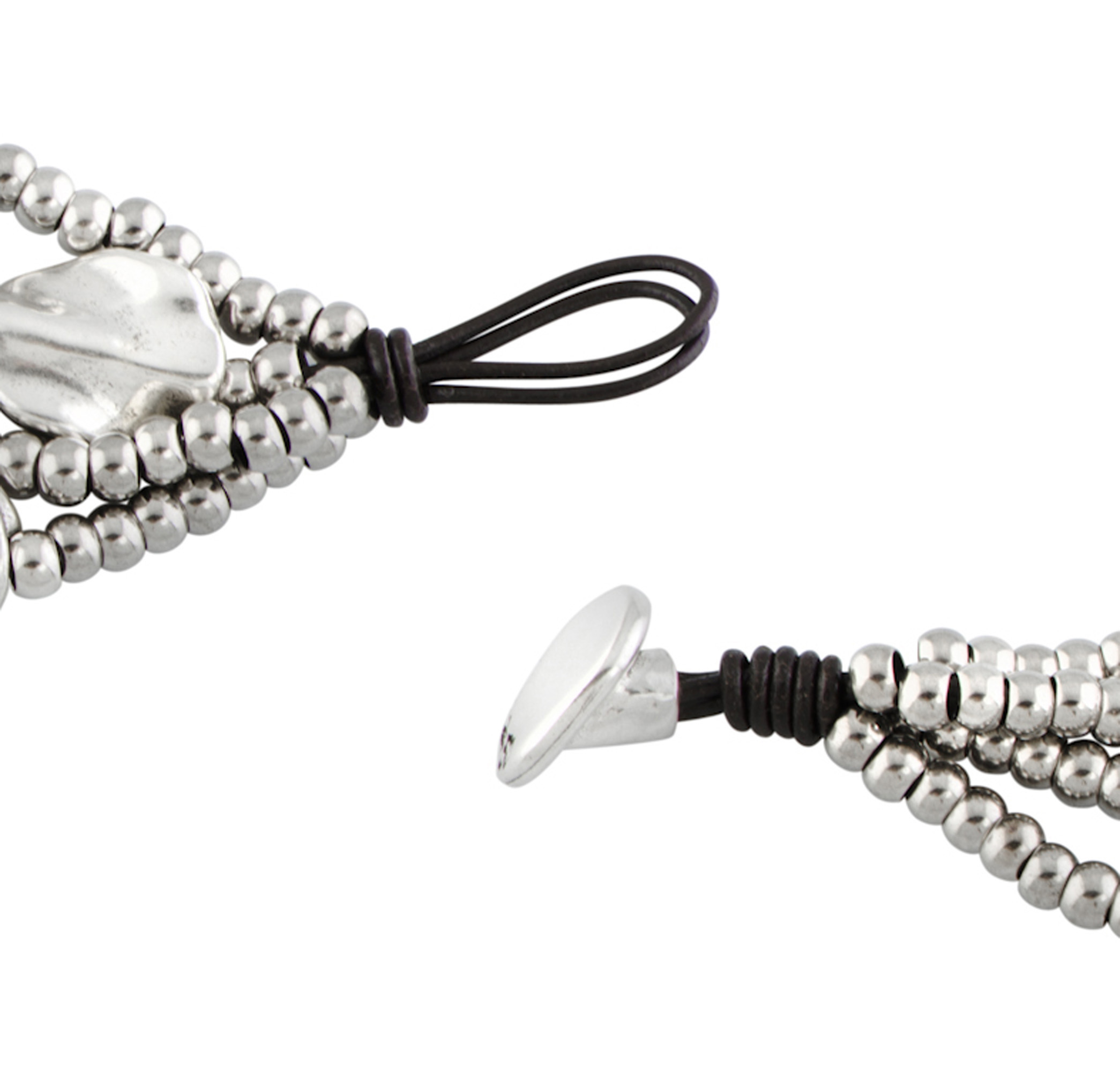 Женский браслет с несколькими рядами кожаных нитей и бусин, с застежкой из металлического сплава с серебряным покрытием. На застежке выгравирован логотип UNO de 50.
