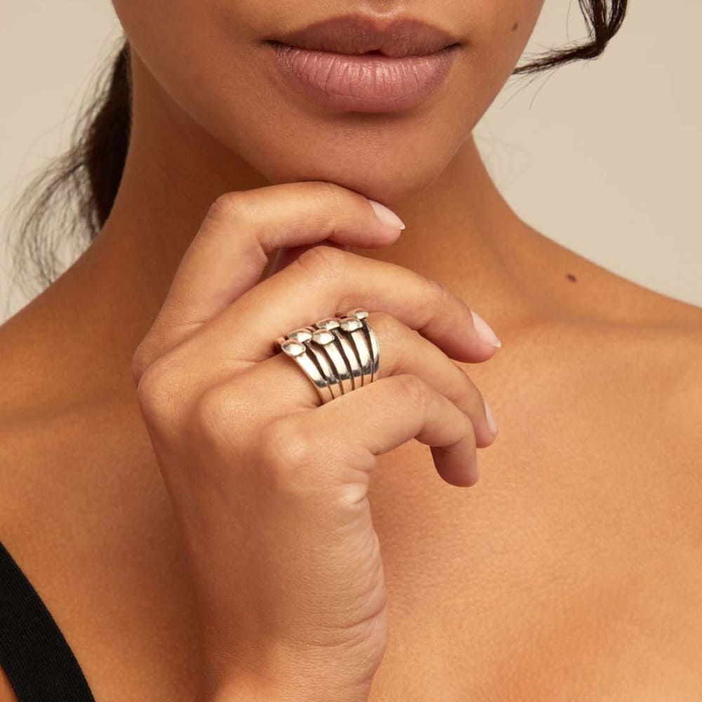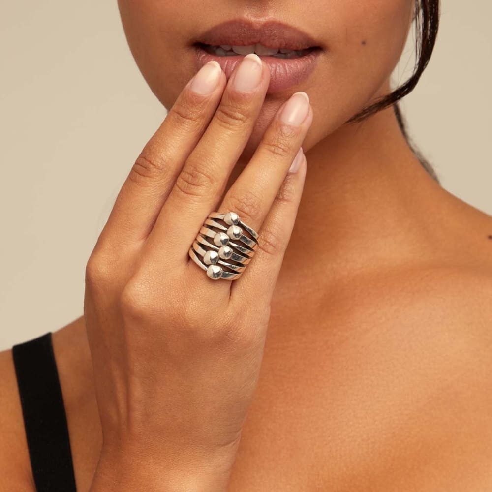 Кольцо ANI0773MTL00012 из сплава ZAMAK с серебряным покрытием с эффектом многослойности, собранное из элементов в виде согнутых гвоздей
