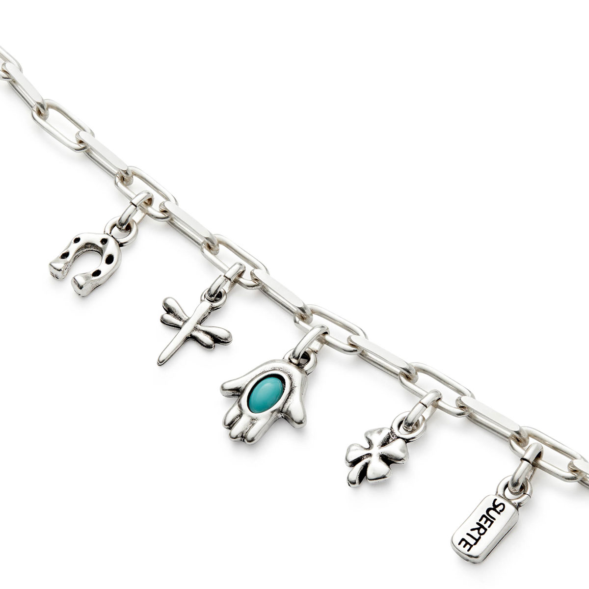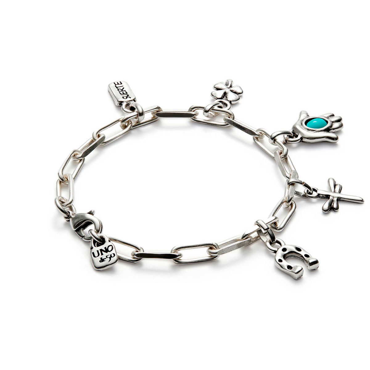 Носите все любимые талисманы с собой благодаря браслету с бирюзой, с серебром, арт. PUL2565TQSMTL из коллекции SER UNICO. Изделие представляет собой цепочку из крупных прямоугольных звеньев, которая украшена сразу пятью подвесками. Каждый шарм несет свой символический смысл. Подкова, четырехлистный клевер и медальон с надписью Suerte привлекают удачу, рука Фатимы, декорированная бирюзой, служит защитой и поддержкой, стрекоза дарит ощущение легкости. Застежка-карабин дополнительно декорирована культовым замочком UNOde50, подчеркивающим эксклюзивность украшения ручной работы, изготовленного из уникального сплава ZAMAK. Браслет, наполненный символизмом, станет украшением, которое добавит магии в любой образ.