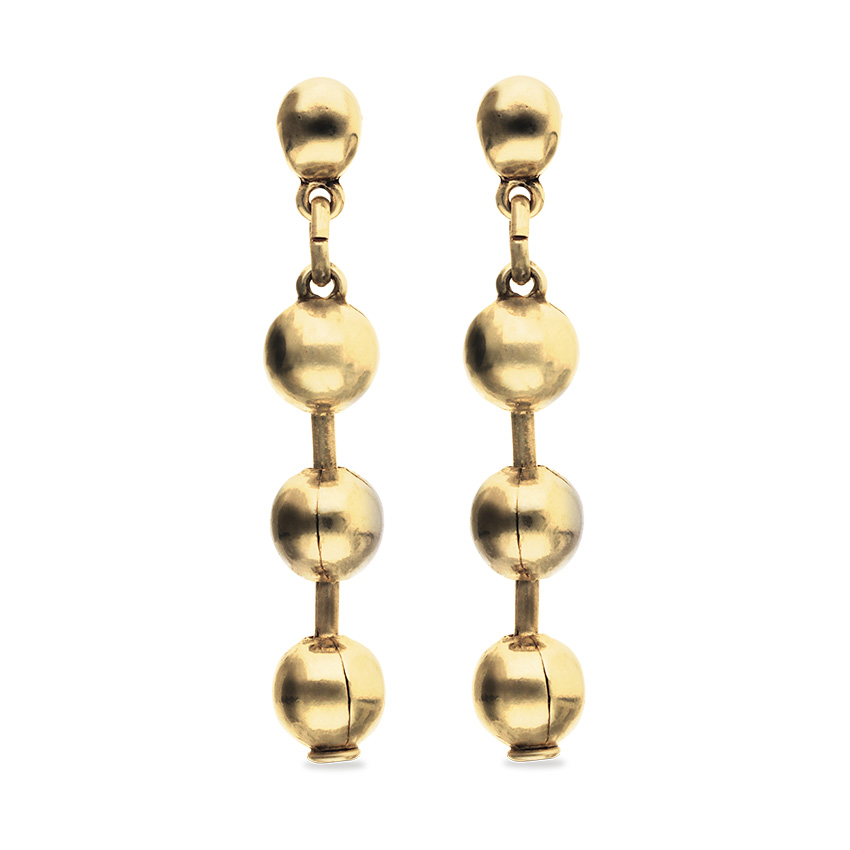 Серьги выполнены из металлических бусин из сплава ZAMAK с золотым покрытием. Подвижная конструкция задает динамику, а застежка-гвоздик надежно фиксирует украшение в ухе. Серьги легко впишутся в любые образы и станут напоминанием о ценности паузы — той самой, в которой рождаются трепетные чувства.