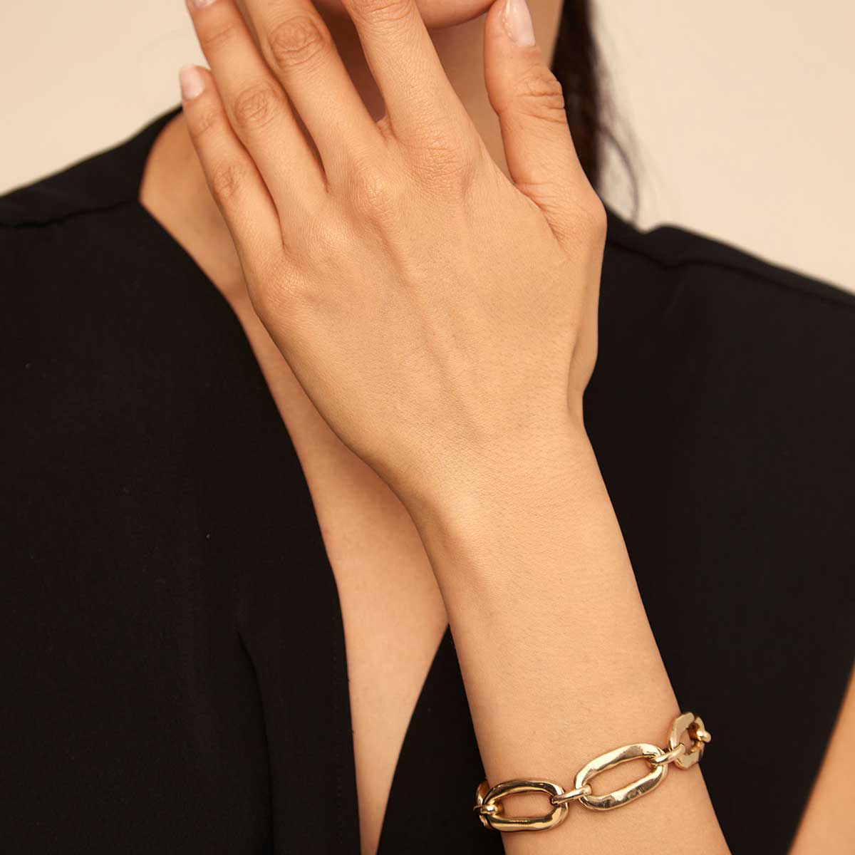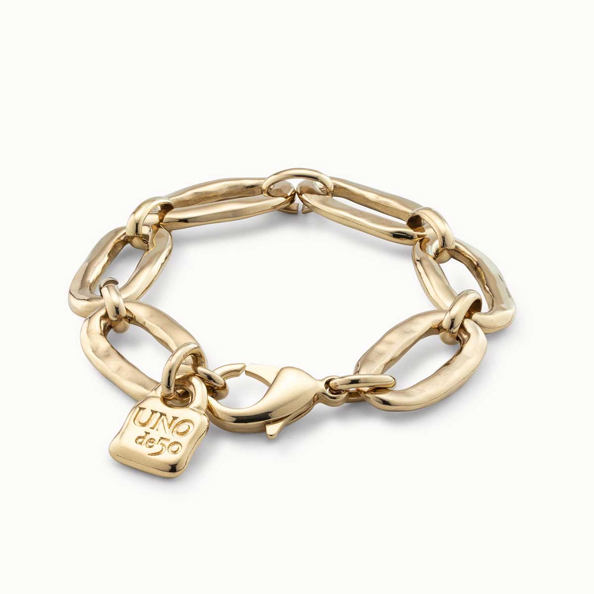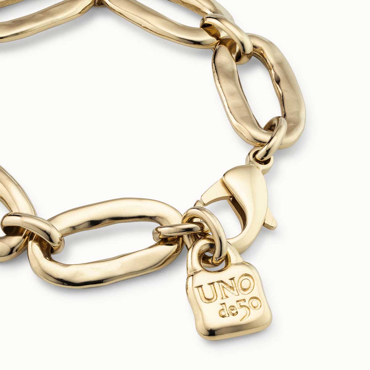 Женский браслет из металического сплава с золотым покрытием и овальными звеньями, украшенный фирменным висячим замочком UNOde50.