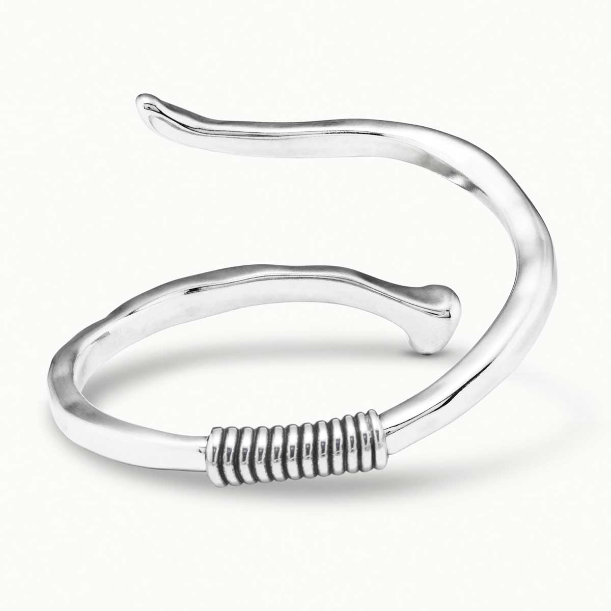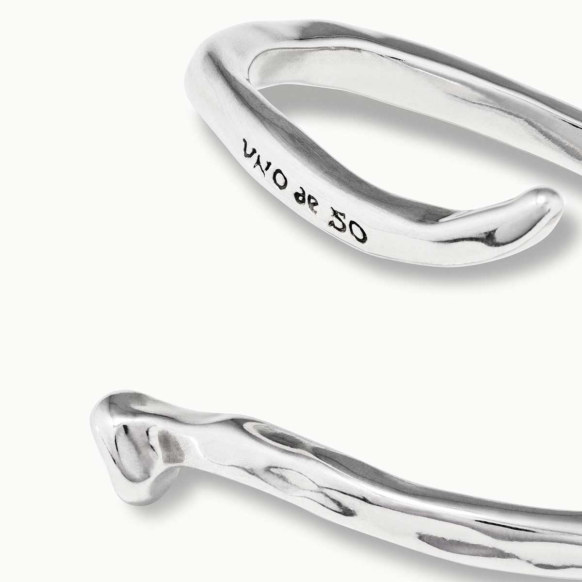 Легендарный браслет бренда UNOde50. Жесткий незамкнутый браслет из посеребренного металла в форме гвоздя, согнутого в спираль. Браслет открывается и закрывается с помощью пружины, расположенной в центре. Дерзкое и смелое украшение идеально повторяет форму запястья. Уникальный стиль изделия выражает новаторский дух бренда UNOde50. Произведено в Испании, полностью ручная работа.