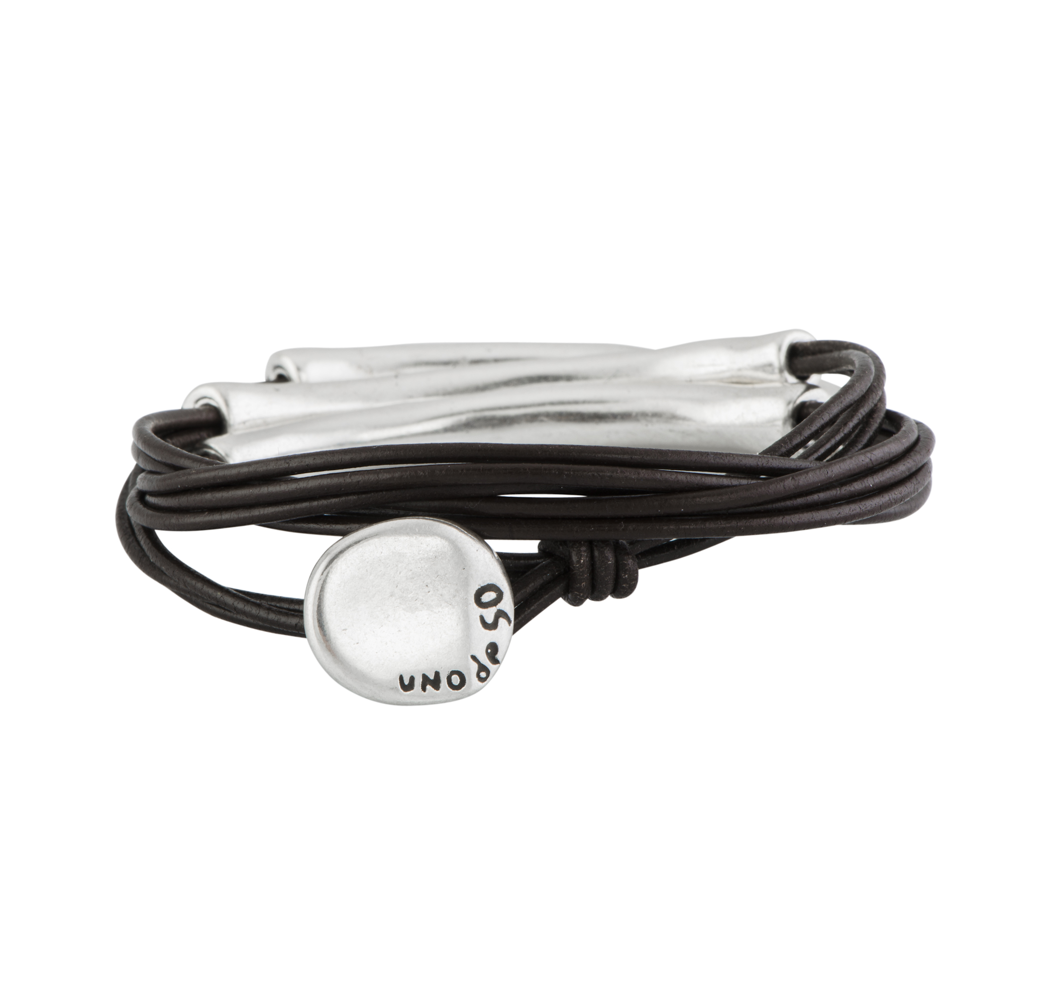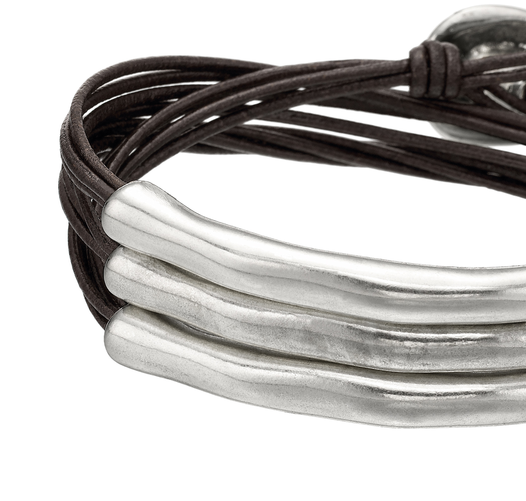 Женский браслет с двумя рядами кожаных нитей и трубчатыми элементами из металлического сплава с серебряным покрытием.