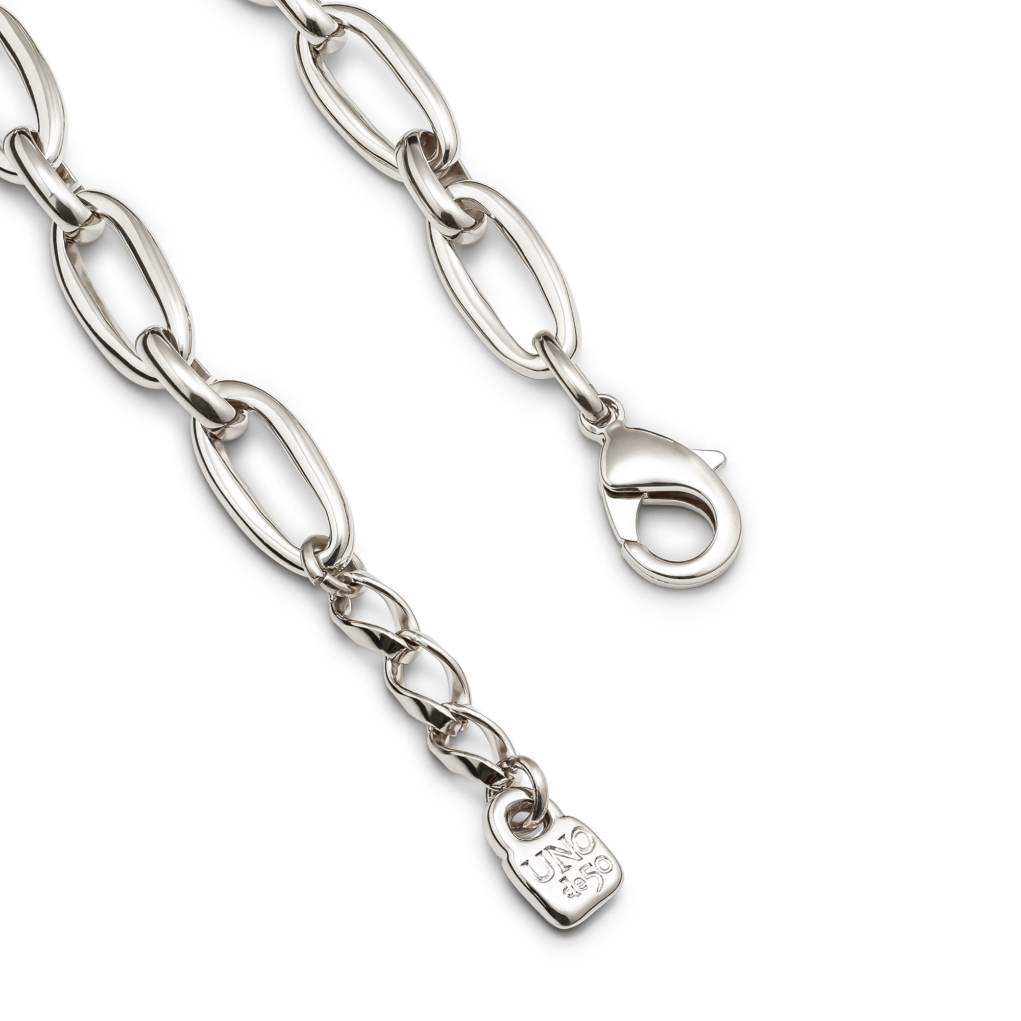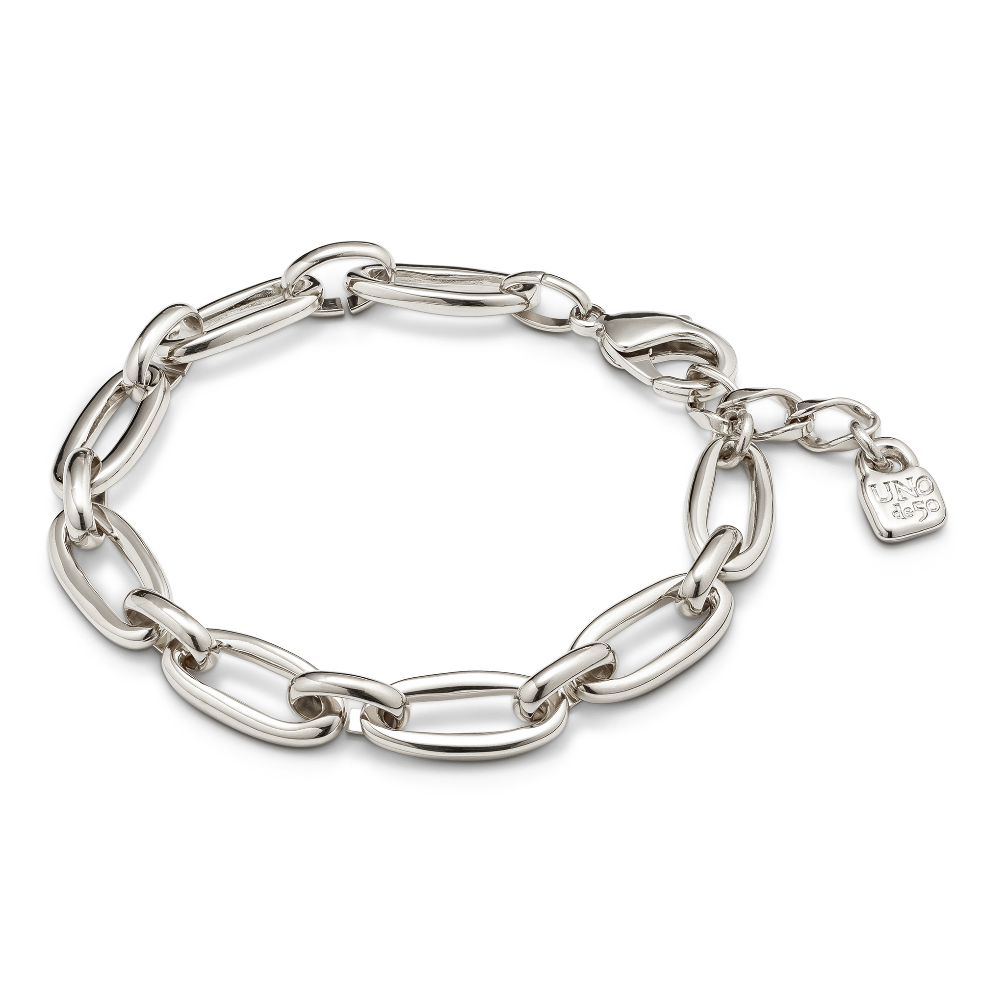 Браслет-цепь PUL2263MTL0000M из овальных звеньев среднего размера и застежкой в виде карабина. Как и все ювелирные изделия UNOde50, он изготовлен вручную в Испании с использованием 100% уникального кустарного процесса и металлического сплава ZAMAK с серебряным покрытием в 15 микрон. Выставляйте напоказ это единственное в своем роде украшение и сделайте его ключевым элементом своей коллекции.